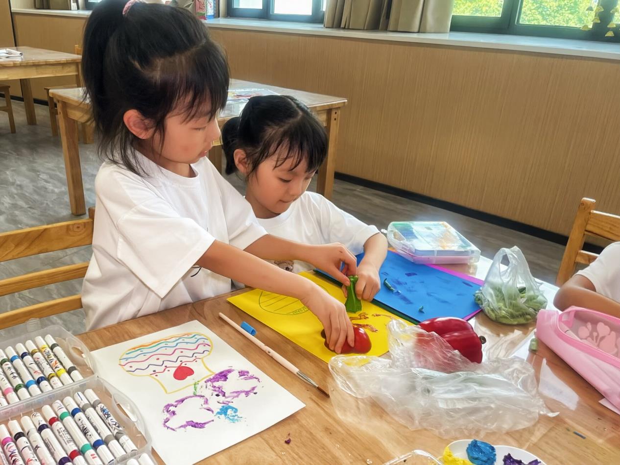 与此同时,在美术室内,另一场别开生面的艺术创作活动也在同步进行。学生们利用采摘的蔬菜,如玉米、苦瓜、青椒等,进行拓印画创作。在美术教师的指导下,学生们发挥想象力,用水彩颜料在画纸上留下了蔬菜的独特纹理和色彩。一幅幅充满创意和童趣的拓印画作品诞生了,它们被展示在“夏至作品展台”,成了活动现场的一道亮丽风景线。