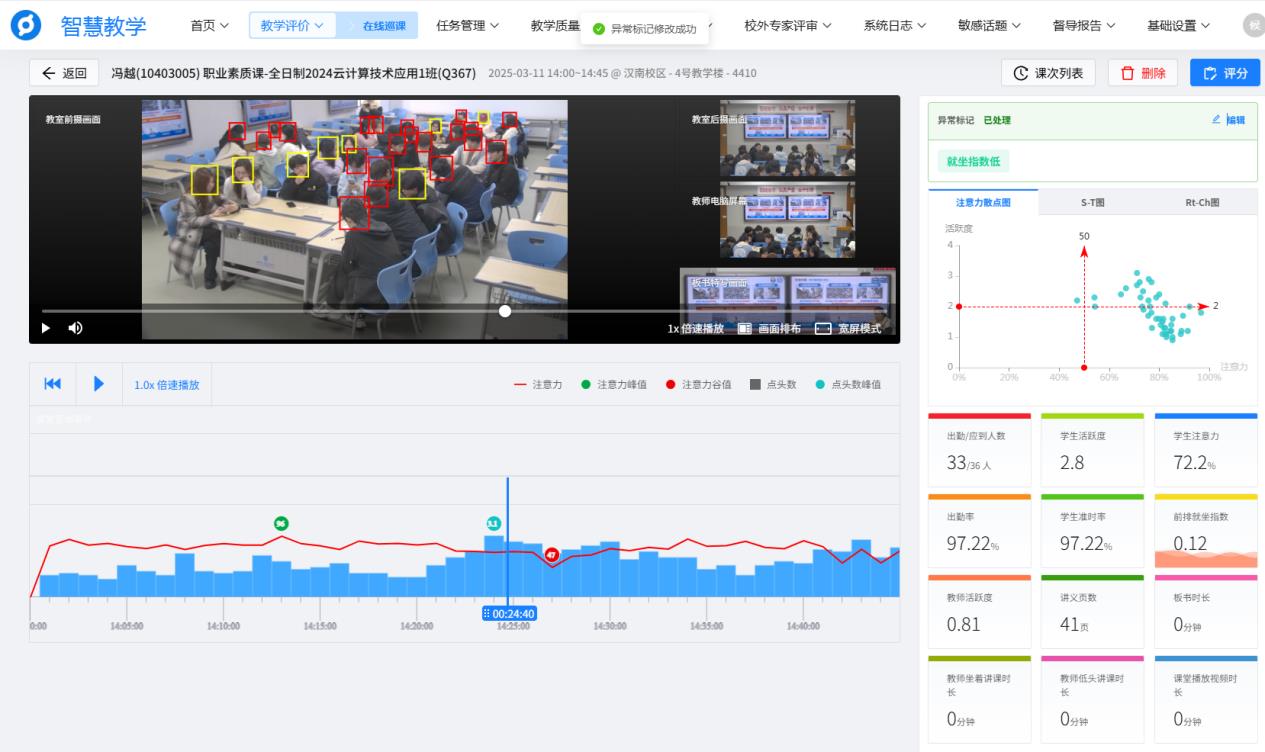 该校教务处长张卫利表示:“在使用智慧教室的AI学情分析功能后,我深感课堂教学及管理工作变得更加精准高效。目前我们学校智慧教室绑定了金课坊教学平台,通过平台提供的课堂出勤率、抬头率、点头等数据,能让老师实时且精准地把握学生在课堂上的状态,极大地改变了教师以往仅凭经验判断教学情况的模式,使教学更具针对性,也为教学评价提供了更科学有效的依据。”数据显示,学生自主学习时长同比增长60%,教学效能显著提升。学校运用AI智慧教学平台建成微课达1060门,在线学员达八千余人;开设系列虚拟教学资源,有效弥补了传统实践教学中存在的操作局限性。学校管理效能也同步跃升——运维响应效率提升60%以上。调研显示,师生满意度达95%以上。
