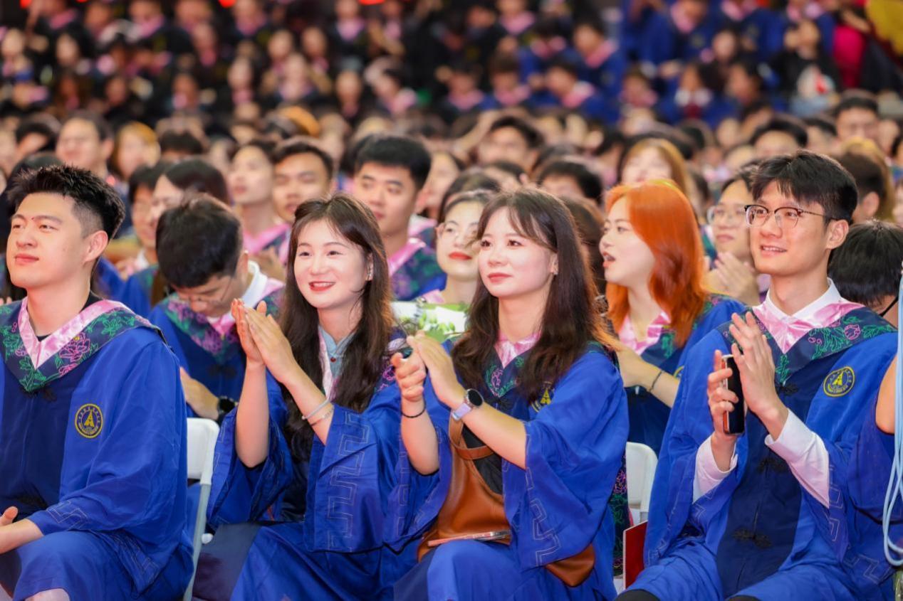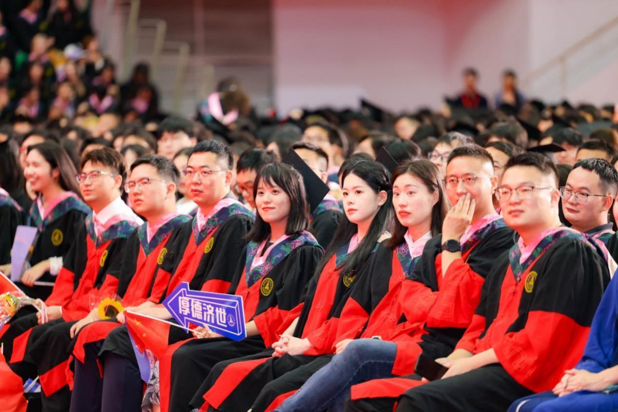 教师代表、经济学院院长石智雷向同学们分享了柏拉图的“洞穴寓言”。他认为,同学们在大学之前的人生,是经历的第一个“洞穴”,大学四年则是努力走出洞穴的过程。毕业证书就像洞穴中照明的火把,闪烁着荣耀与认可的光芒。希望同学们持“求真”之心、永远学习,怀“家国”之情、传递星火,以“躬行”之态,回馈社会,朝着太阳的方向前进,寻找更真实、更光明、更广大的世界。