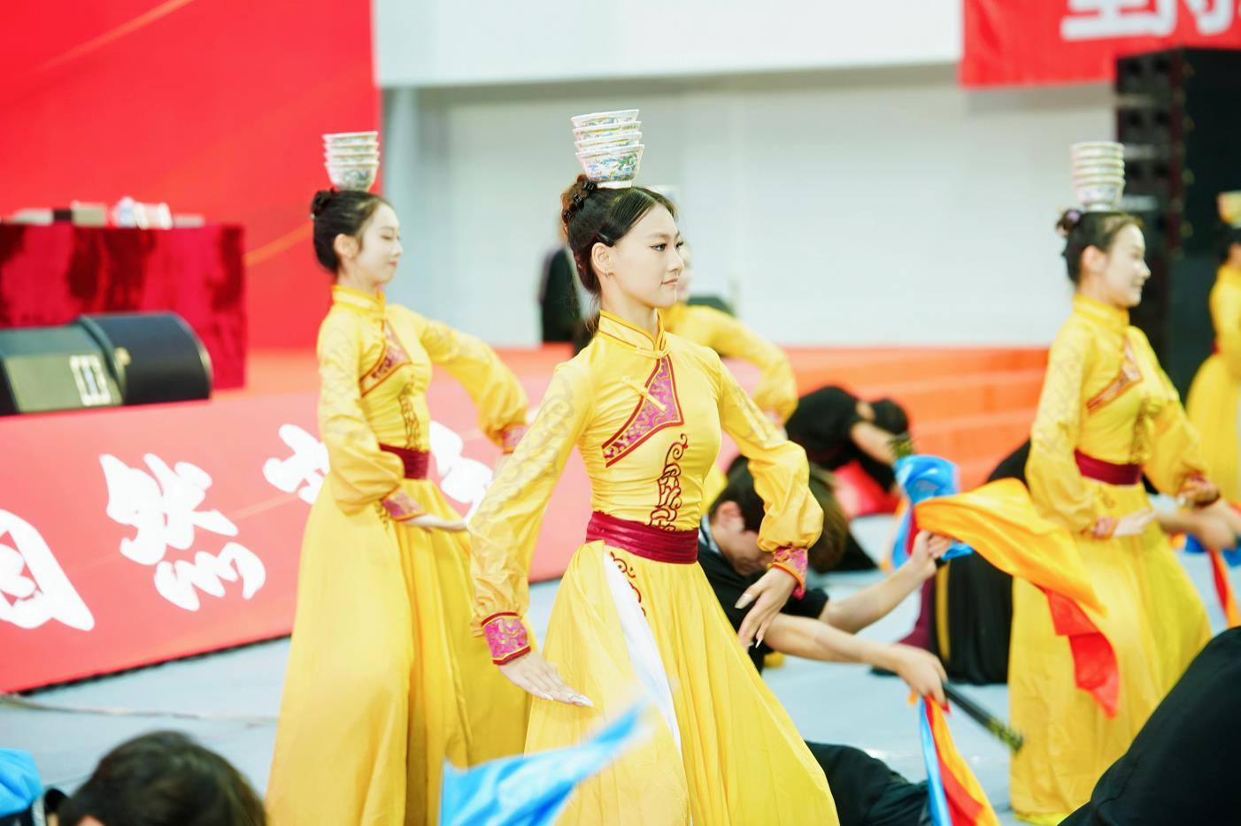 毕业典礼启幕前,一场洋溢青春活力的快闪表演燃动全场。社区辅导员手捧向日葵,深情合唱《世界赠予我的》,将“前路坦荡”的美好祝愿化作歌声流淌;现场互动抽奖环节别出心裁,把母校的温情祝福注入原创“双子塔”玩偶,让幸运毕业生将这份牵挂随身携带。音乐舞蹈学院120名学生带来的原创中国民间舞组合《礼赞》,以浪潮奔涌般的蓬勃姿态点燃现场氛围;毕业主题快闪《我爱你中国》旋律激昂,歌声铿锵,谱写出热血飞扬的青春乐章。在毕业主题视频《鲜花》的光影流转中,毕业生们互正衣冠。随后,毕业典礼在全体师生齐唱国歌中拉开帷幕。