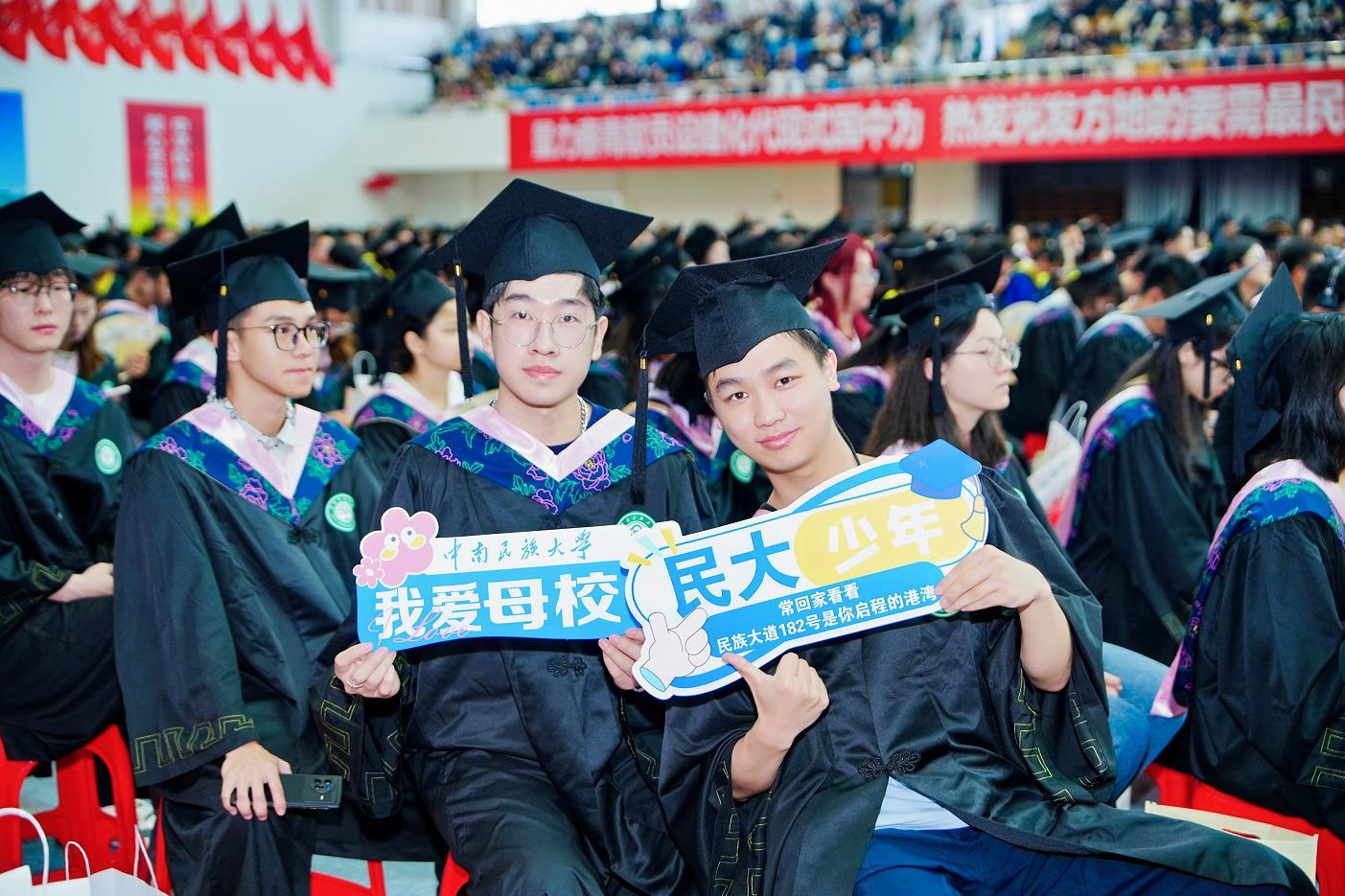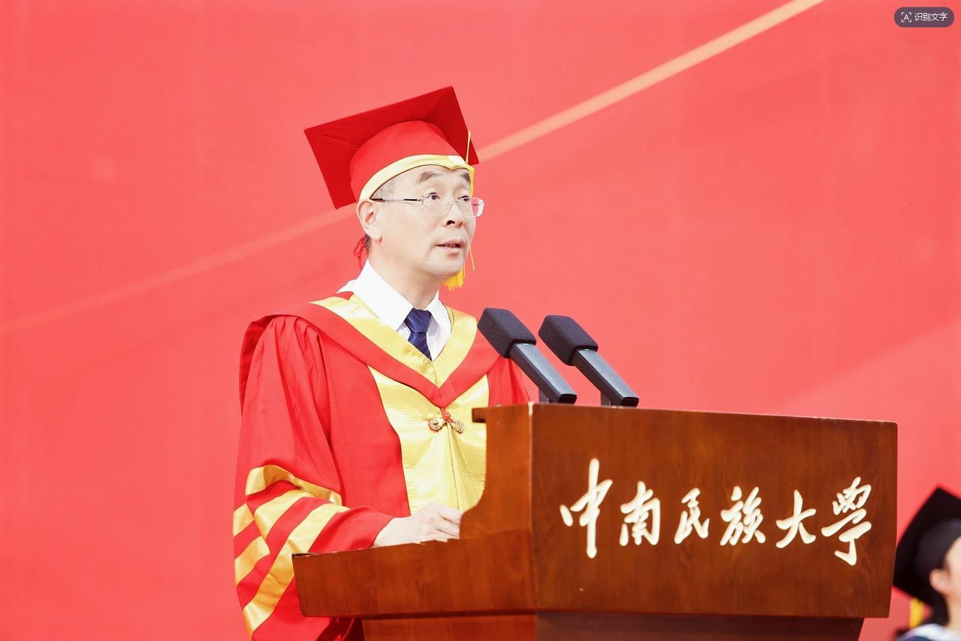 来自该校经济学院的李少卓作为毕业本科生代表发言。他提到,南湖的晨雾、双塔的巍峨、绽放的花墙都是学校给予2025届学子独特的记忆坐标。“在‘笃信好学,自然宽和’的校训指引下,中南民大学子定能勇立时代潮头,在强国建设、民族复兴的壮阔征程中镌刻属于我们的璀璨印记,让今日的中南民大为明日的我们而感到自豪!”