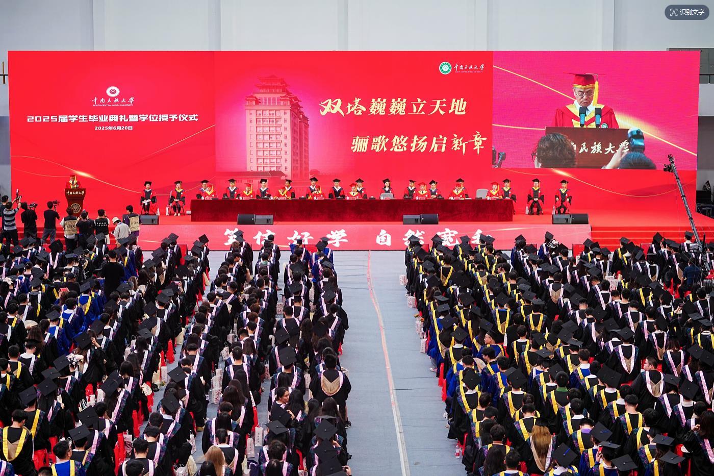 双塔巍巍立天地,骊歌悠扬启新章。6月20日,中南民族大学2025届学生毕业典礼暨学位授予仪式在该校体育馆举行。7555名博士、硕士、本科毕业生圆满完成学业,带着母校的嘱托与祝福,开启人生崭新篇章。