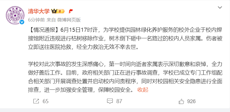 6月20日下午,@清华大学发布通报:6月15日17时许,为学校提供园林绿化养护服务的校外企业于校内焊接馆附近违规进行枯树移除作业,树木倒下砸中一名路过的校内人员家属。伤者被立即送往医院抢救,经全力救治无效不幸去世。