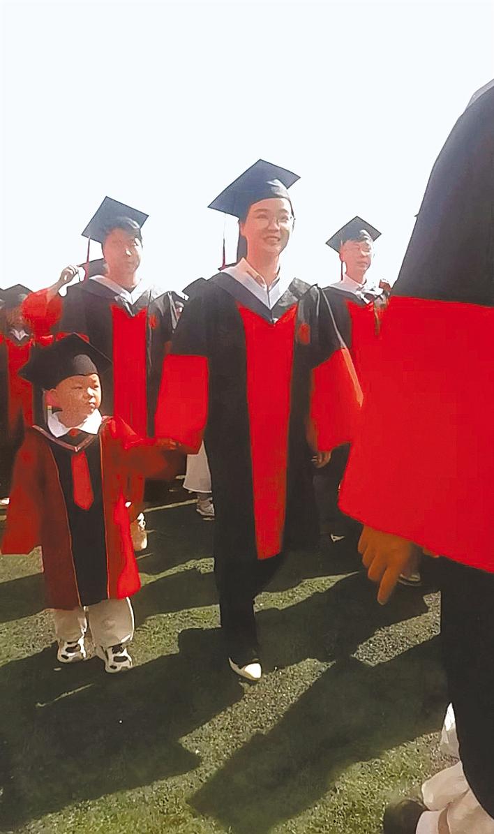 6月18日,武汉科技大学2025届毕业典礼暨学位授予仪式上,该校法学与经济学院硕士毕业生张硕带着1岁半的儿子一起出席,还特意给儿子穿上了学士装。32岁的张硕此前边工作边考研,2021年考入武科大读研,那一年,他的妻子怀孕了,孩子的出生和成长伴随了他整个研究生的学习生涯。他说,读书期间最感谢家人的爱与支持,这次他带着妻儿一同参加毕业典礼,“希望和妻子一起,成为孩子的榜样!”