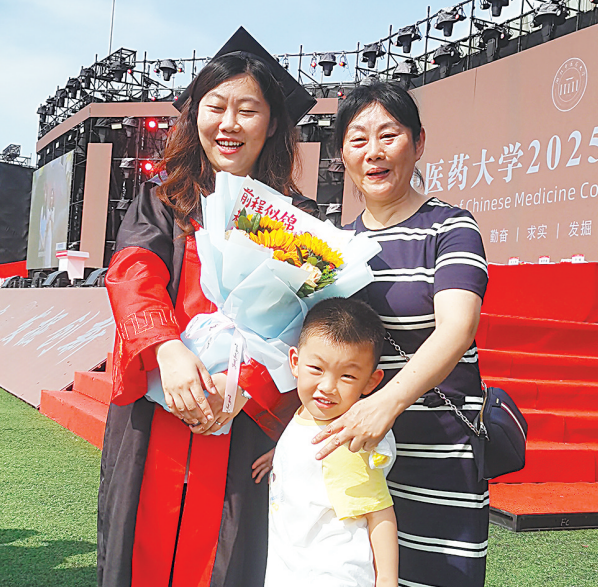 获得湖北中医药大学博士学位的妈妈与孩子、老人一同留影,分享人生喜悦。 (湖北日报全媒记者 包东喜 摄)