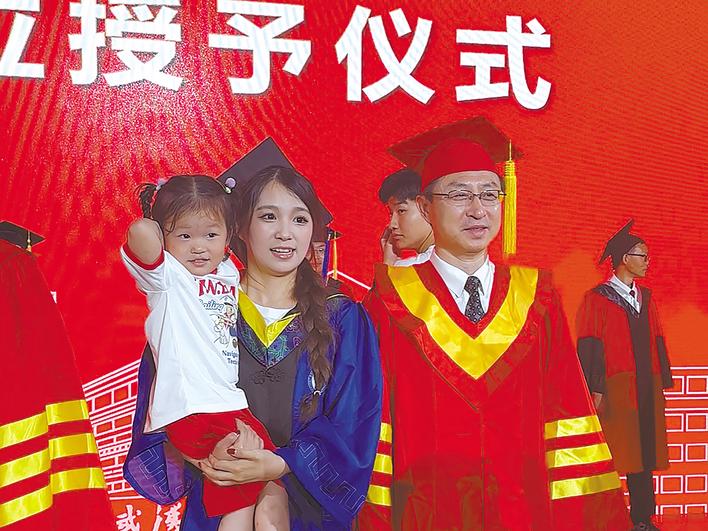 武汉工程大学硕士毕业生让迎玲带着3岁女儿一起上台接受拨穗。 (湖北日报全媒记者 田佩雯 摄)