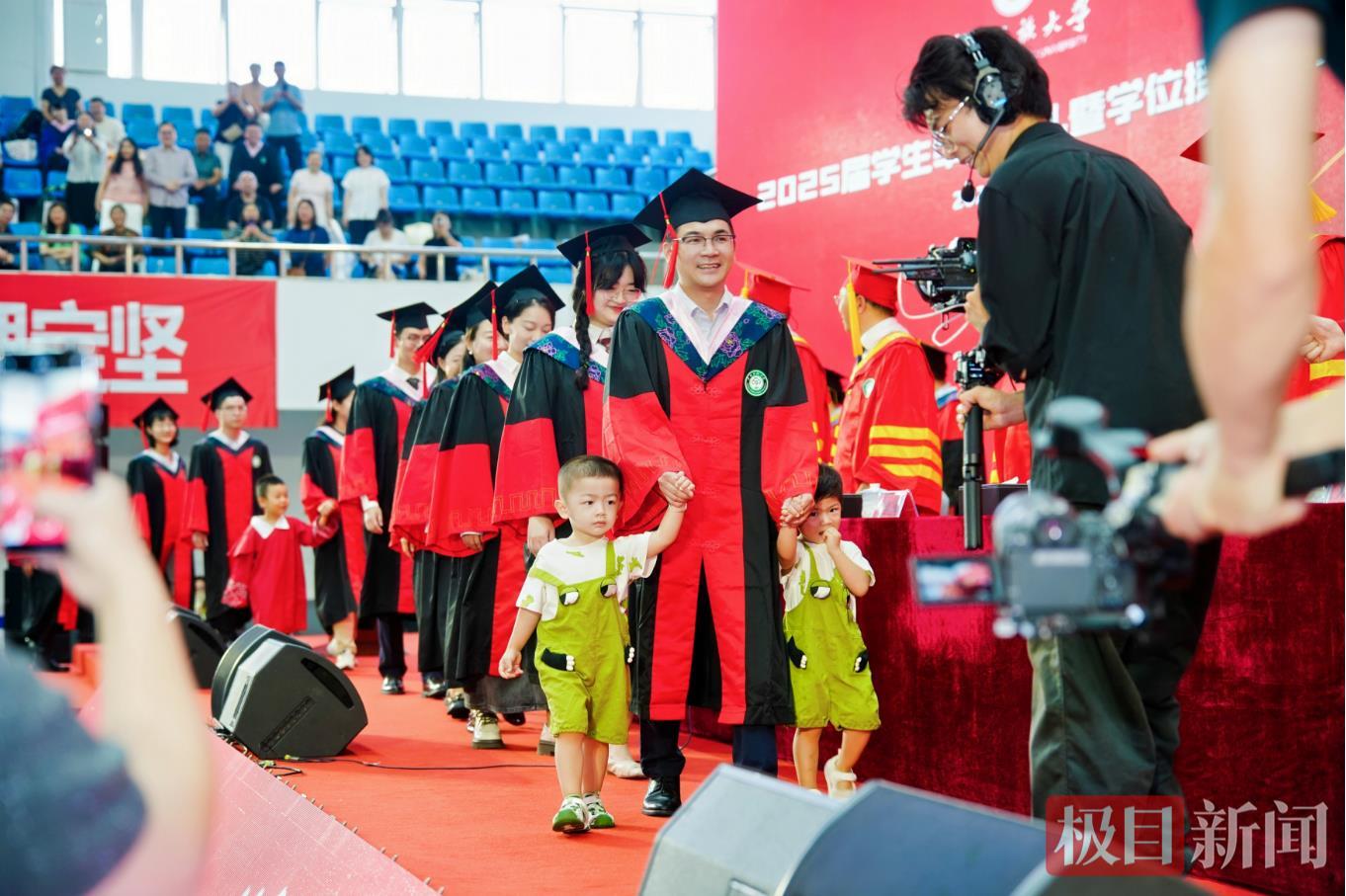 该校中华民族共同体学院马克思主义民族理论与政策专业博士毕业生韦贵方步入会场时引发关注——他牵着两岁多的龙凤胎宝贝一同上台,从导师团手中接过学位证书并完成拨穗仪式,导师们面带温和笑意,目光中满是欣慰与期许。台下的师生们更是瞬间被萌化,不少人举起手机记录下这有趣的一幕,还有人对着龙凤胎宝宝眨眼睛、做鬼脸,现场气氛既庄重又洋溢着满满的温情与欢乐。