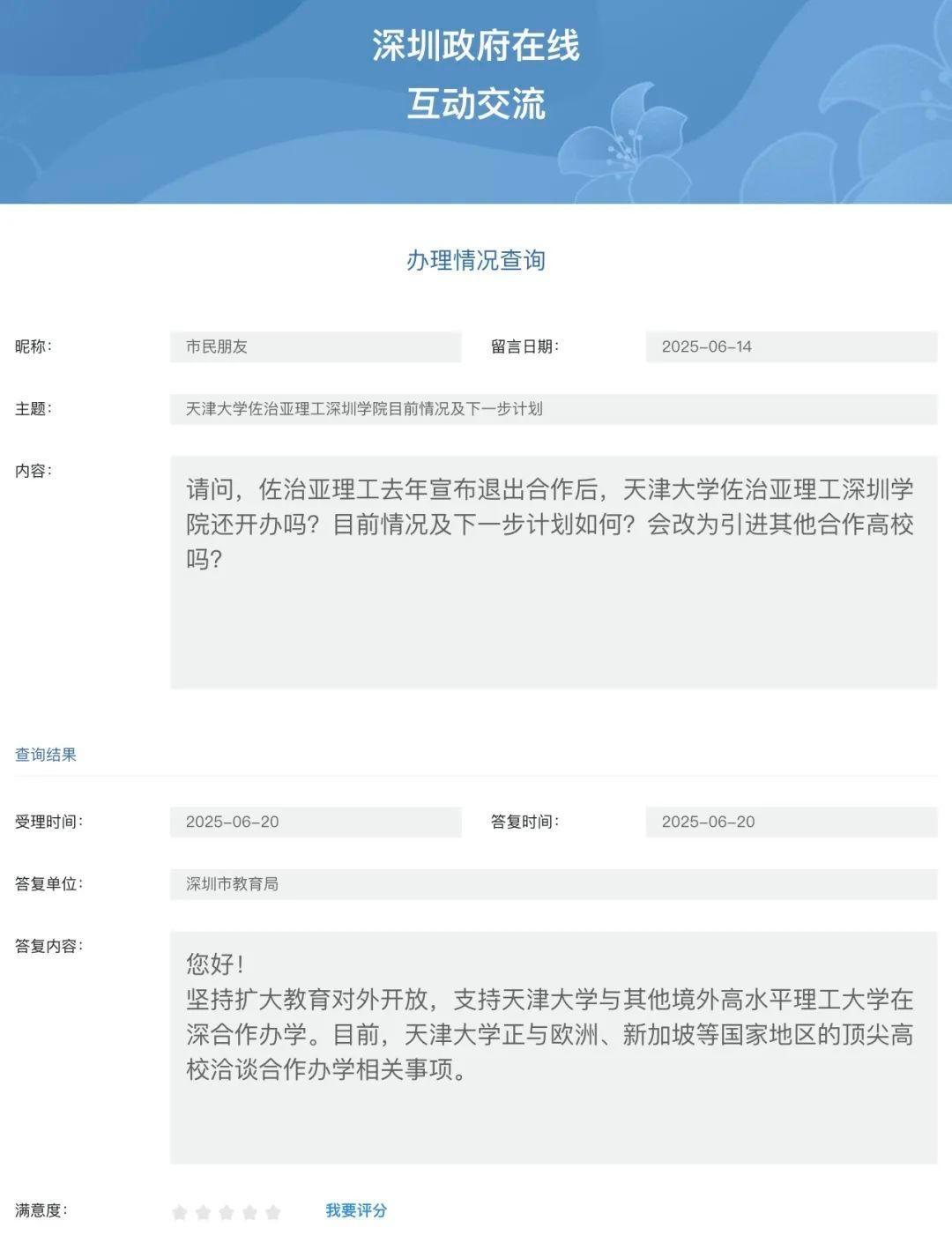 日前,有市民在“深圳政府在线互动交流”中提问:天津大学佐治亚理工深圳学院还开办吗?目前情况及下一步计划如何?6月20日,深圳市教育局回复称:“(深圳市)坚持扩大教育对外开放,支持天津大学与其他境外高水平理工大学在深合作办学。目前,天津大学正与欧洲、新加坡等国家地区的顶尖高校洽谈合作办学相关事项。”