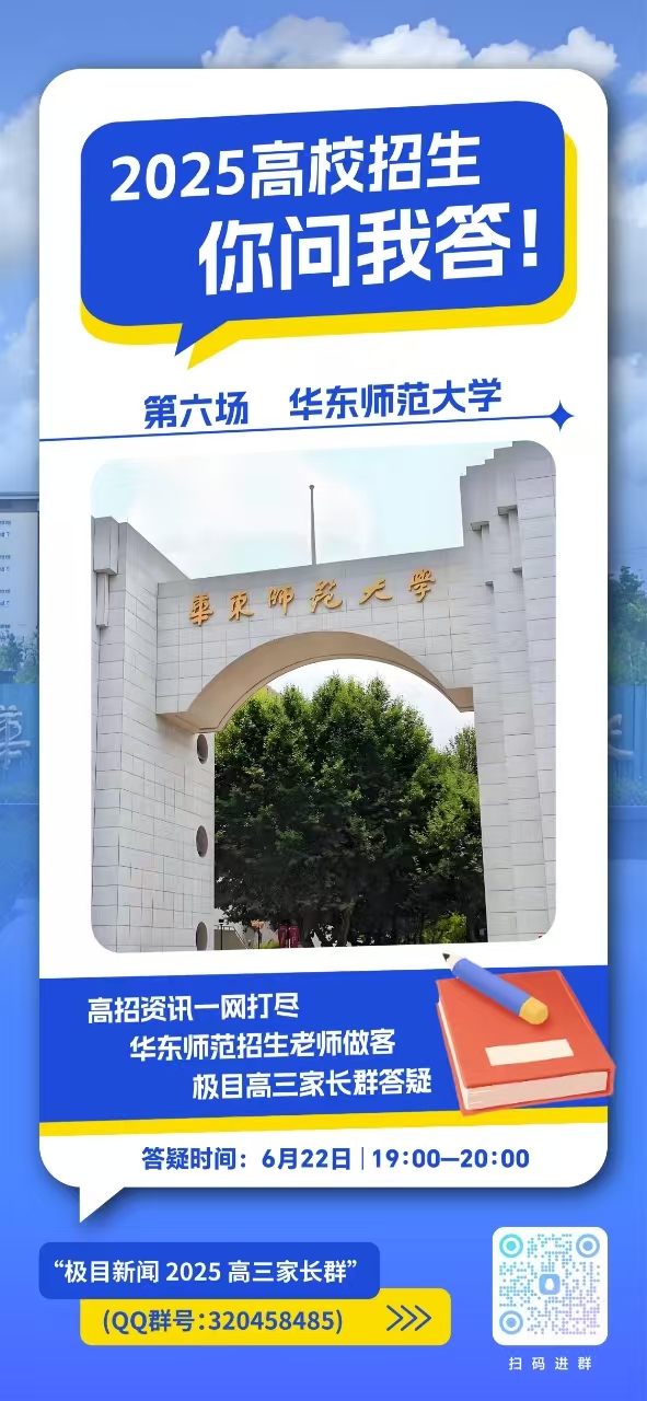 6月22日(本周日)晚上7时30分至8时30分,华东师范大学招生相关负责人将在极目新闻高三家长群进行招生答疑,介绍该校相关专业设置、人才培养特色和2025年招生亮点等内容,欢迎感兴趣的家长进群交流。