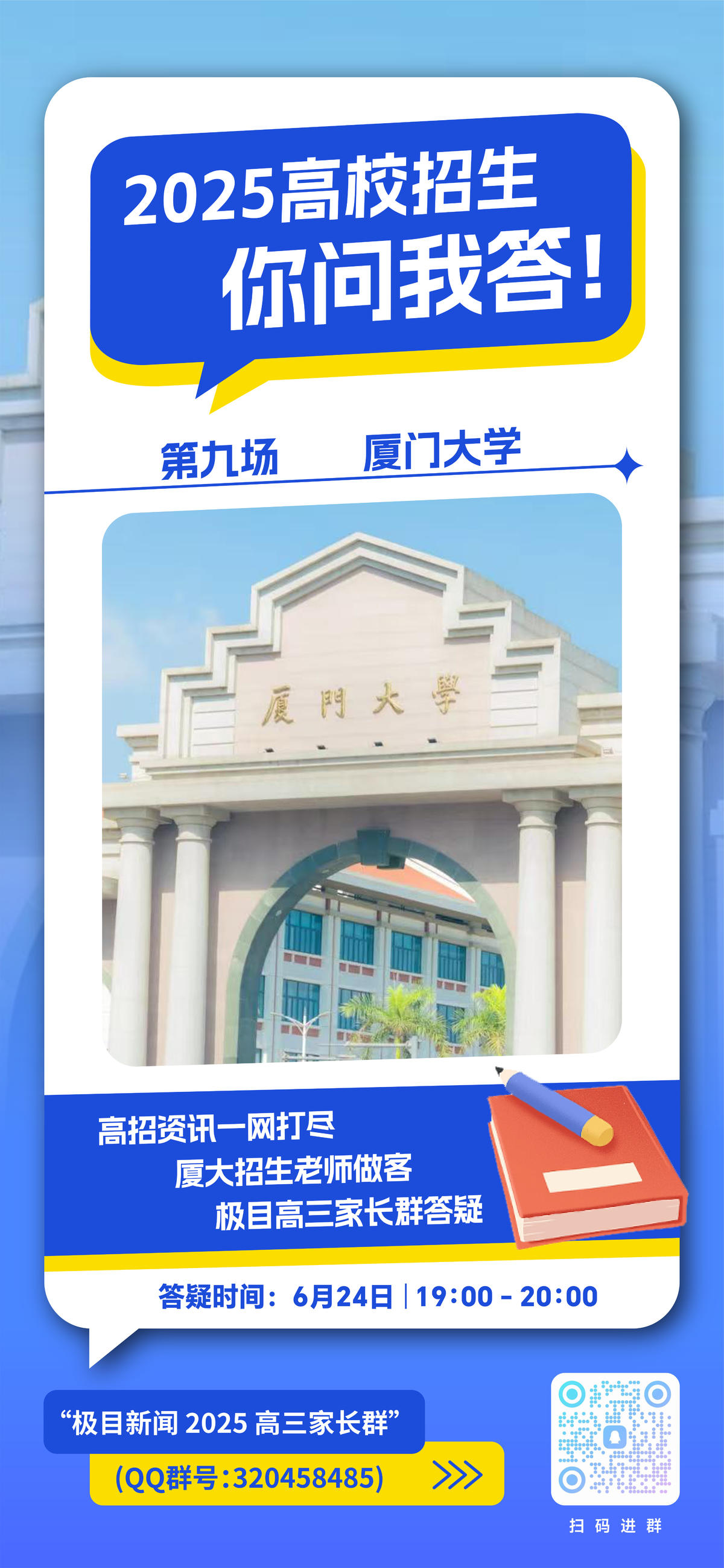 6月24日晚上7时至8时,厦门大学招生相关负责人将在极目新闻高三家长群进行招生答疑,介绍该校相关专业设置、人才培养特色和2025年招生亮点等内容,欢迎感兴趣的家长进群交流。