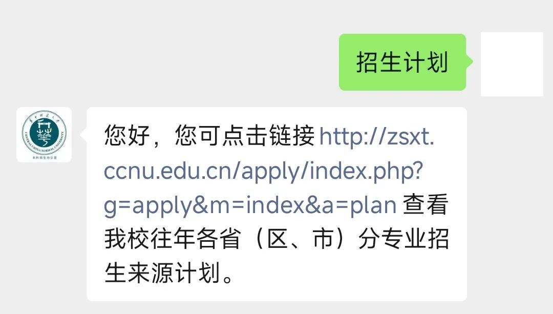 考生和家长也可以直接向我校本科招生微信公众号(华中师范大学本科招生办)发送“招生计划”,点击回复的链接,即可查询2025年招生计划。