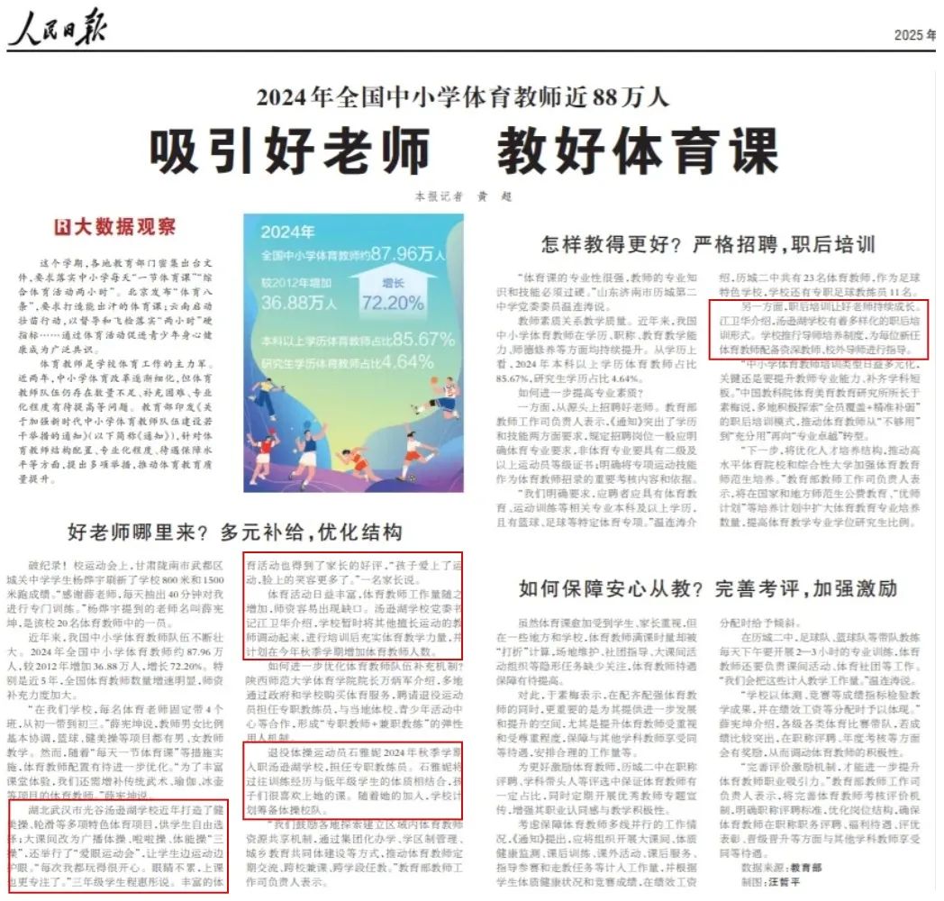 6月20日,《人民日报》要闻版刊发报道《吸引好老师 教好体育课》,报道了光谷汤逊湖学校推动体育教育质量提升的好做法,一起来看——