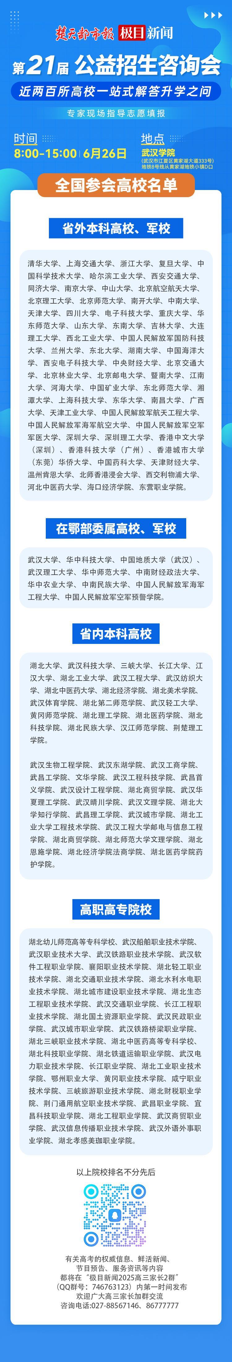 不仅如此,6月26日,极目新闻还将在武汉学院举办线下高招咨询会。现场不仅能与高校招生官面对面交流,还能获取一手招生资料,沉浸式感受大学校园氛围。丰富活动、海量资讯,只等你前来探索。