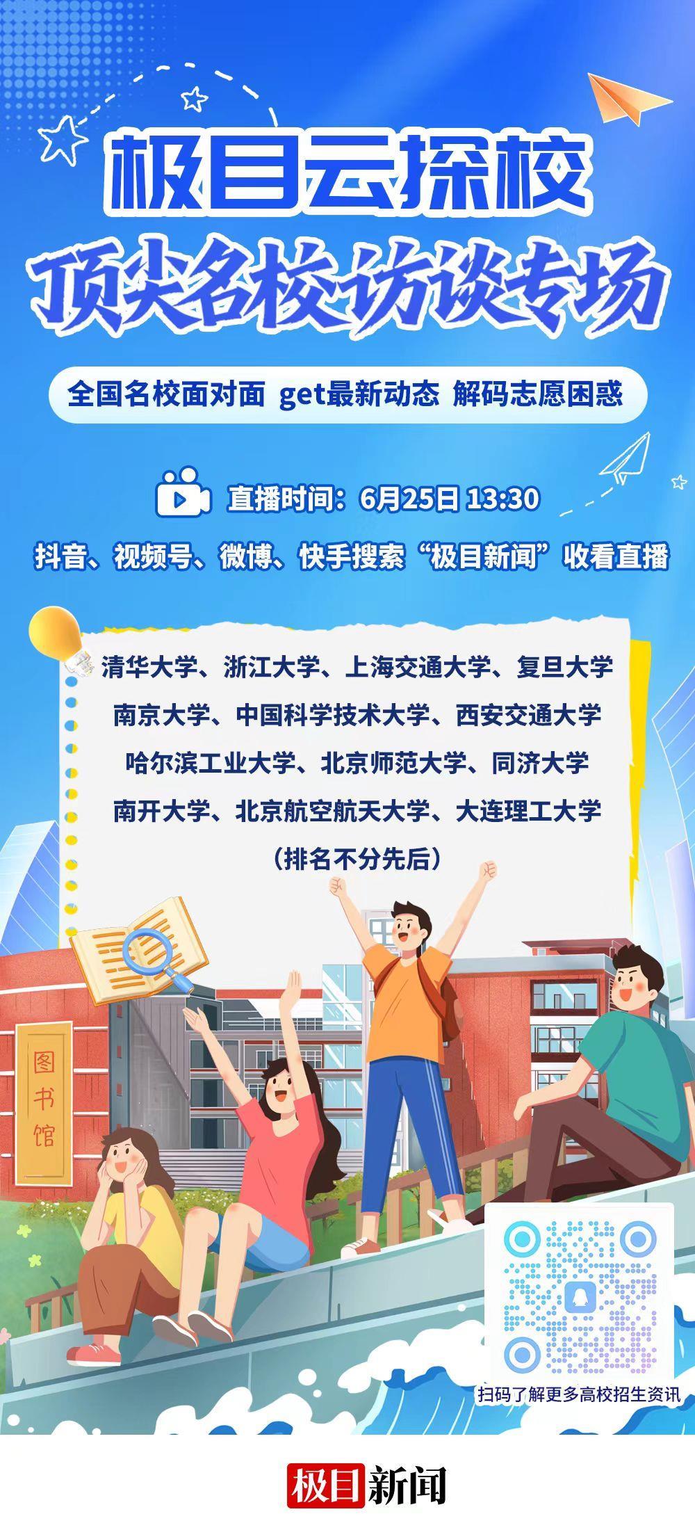 6月25日13:30 ,极目云探校·顶尖名校访谈专场(其中包括清华大学、浙江大学、上海交通大学、复旦大学、南京大学、中国科学技术大学、西安交通大学、哈尔滨工业大学、北京师范大学、同济大学、南开大学、北京航空航天大学、大连理工大学等13所高校)