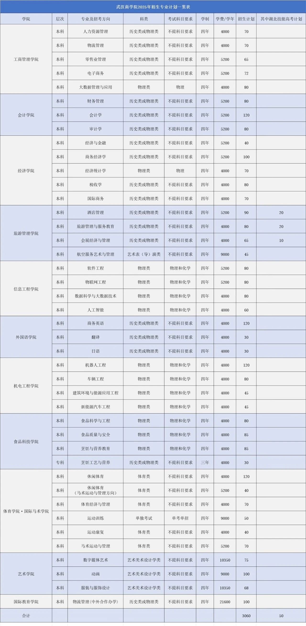 2025年,武汉商学院面向全国19个省、自治区、直辖市招生,总计划招生3060人。湖北省内招生计划2489人。