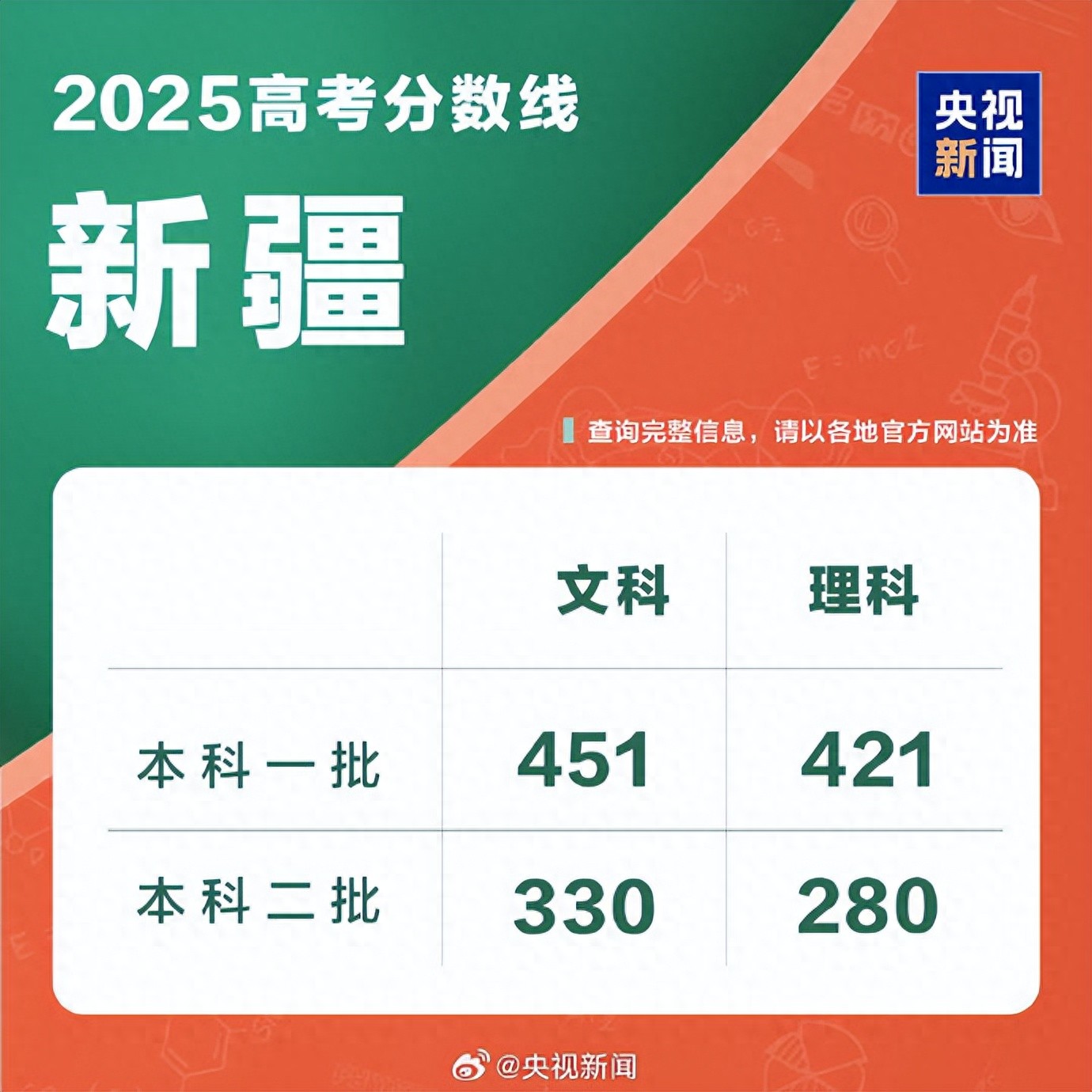 新疆本科一批文科451理科421