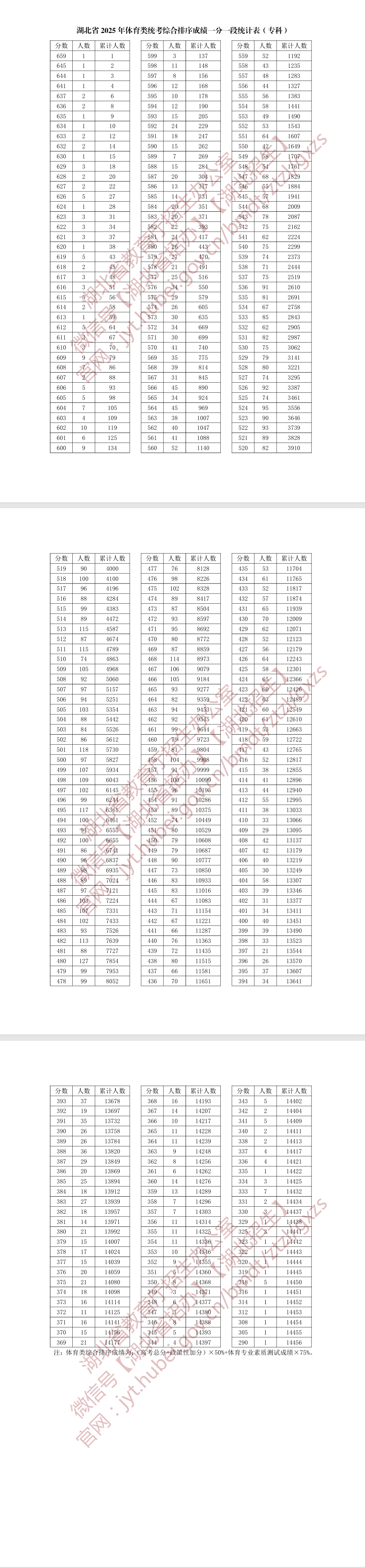 湖北省2025年体育类统考综合排序成绩一分一段统计表(专科)