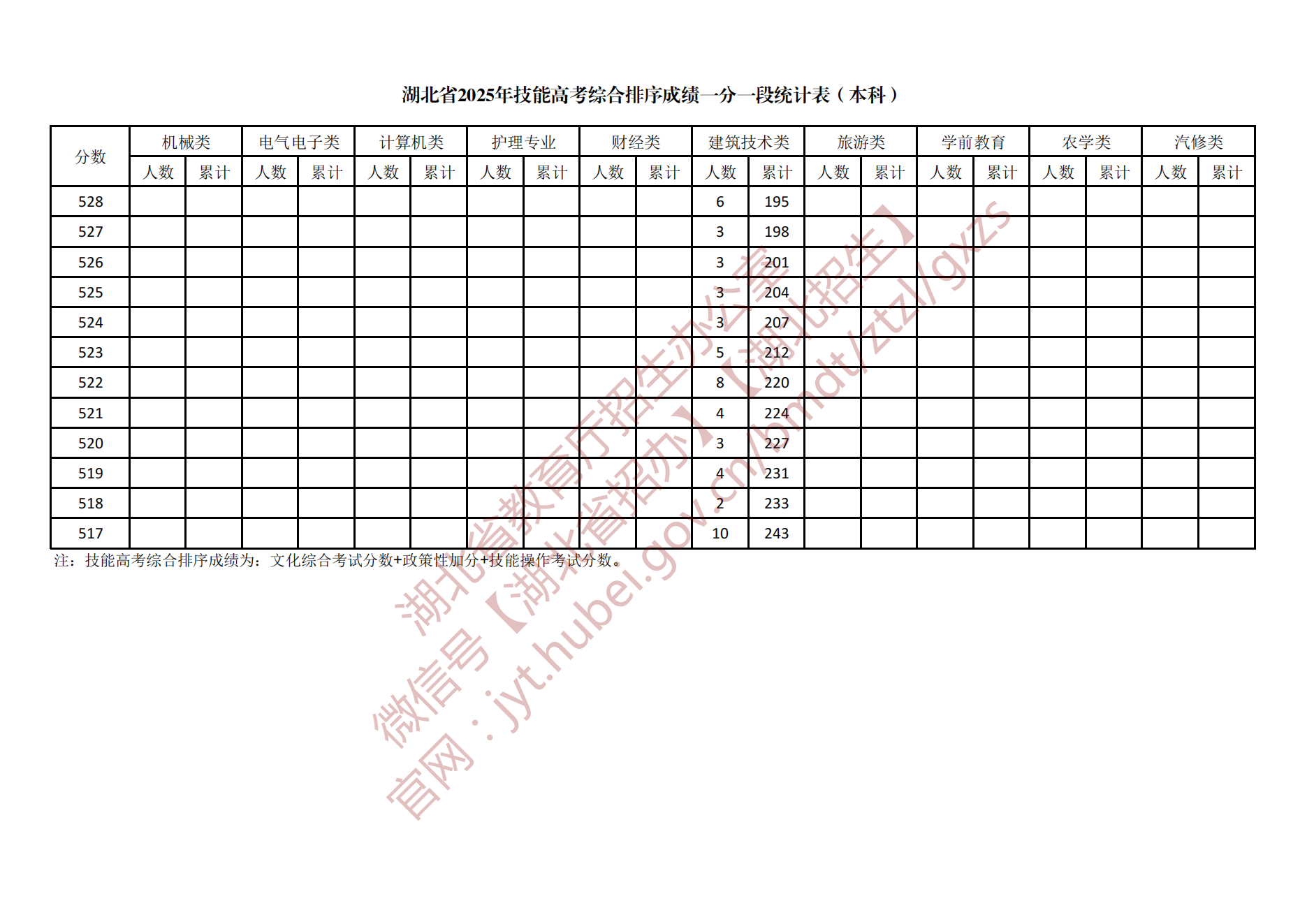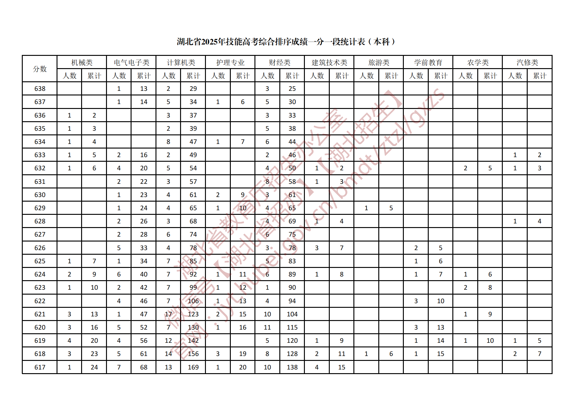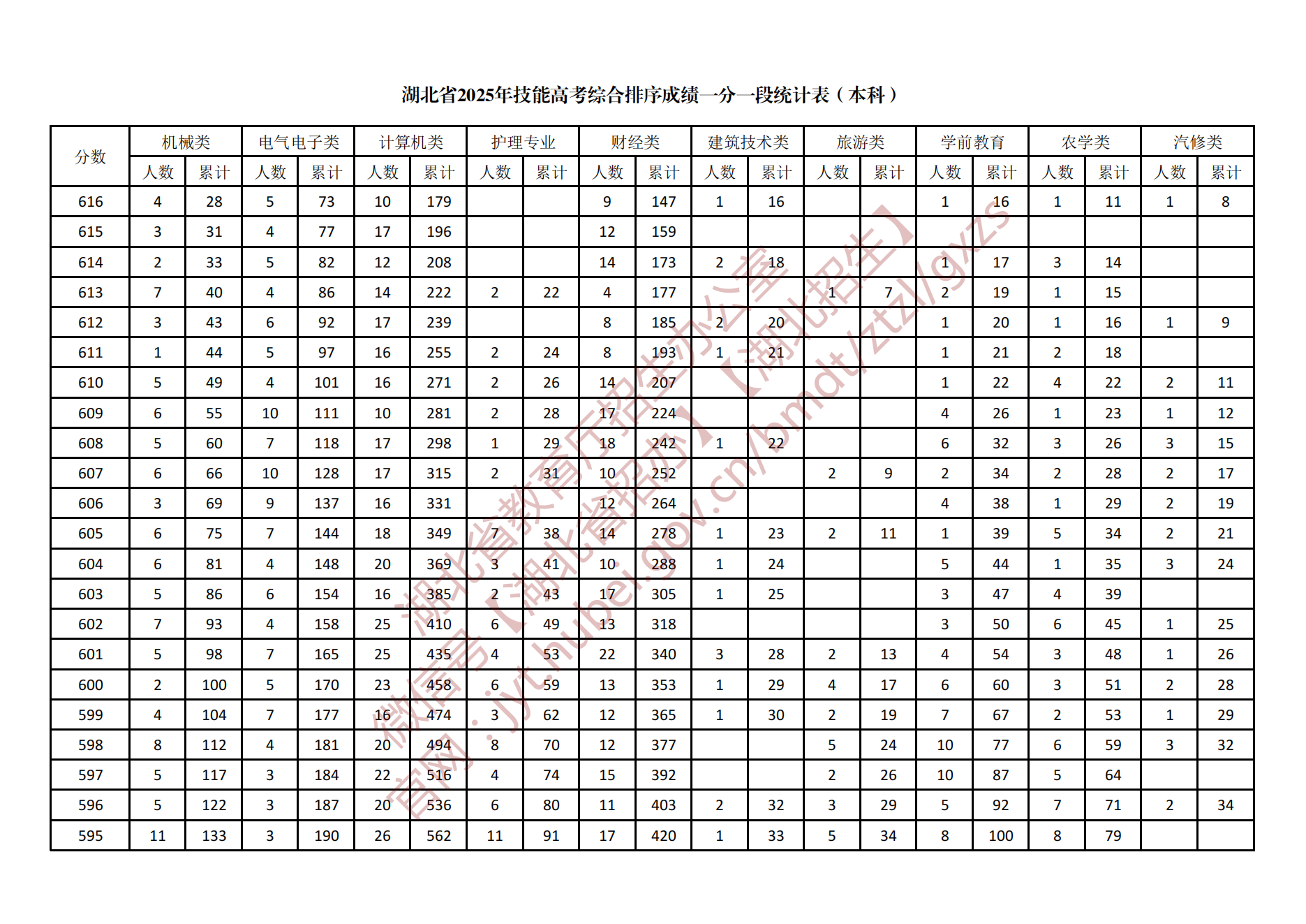 湖北省2025年技能高考综合排序成绩一分一段统计表(本科)