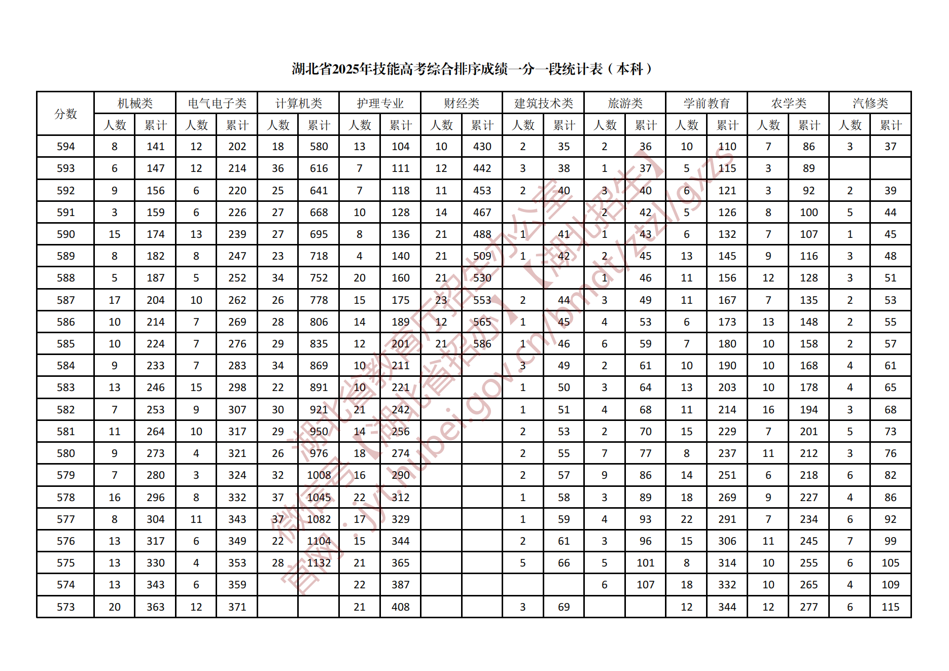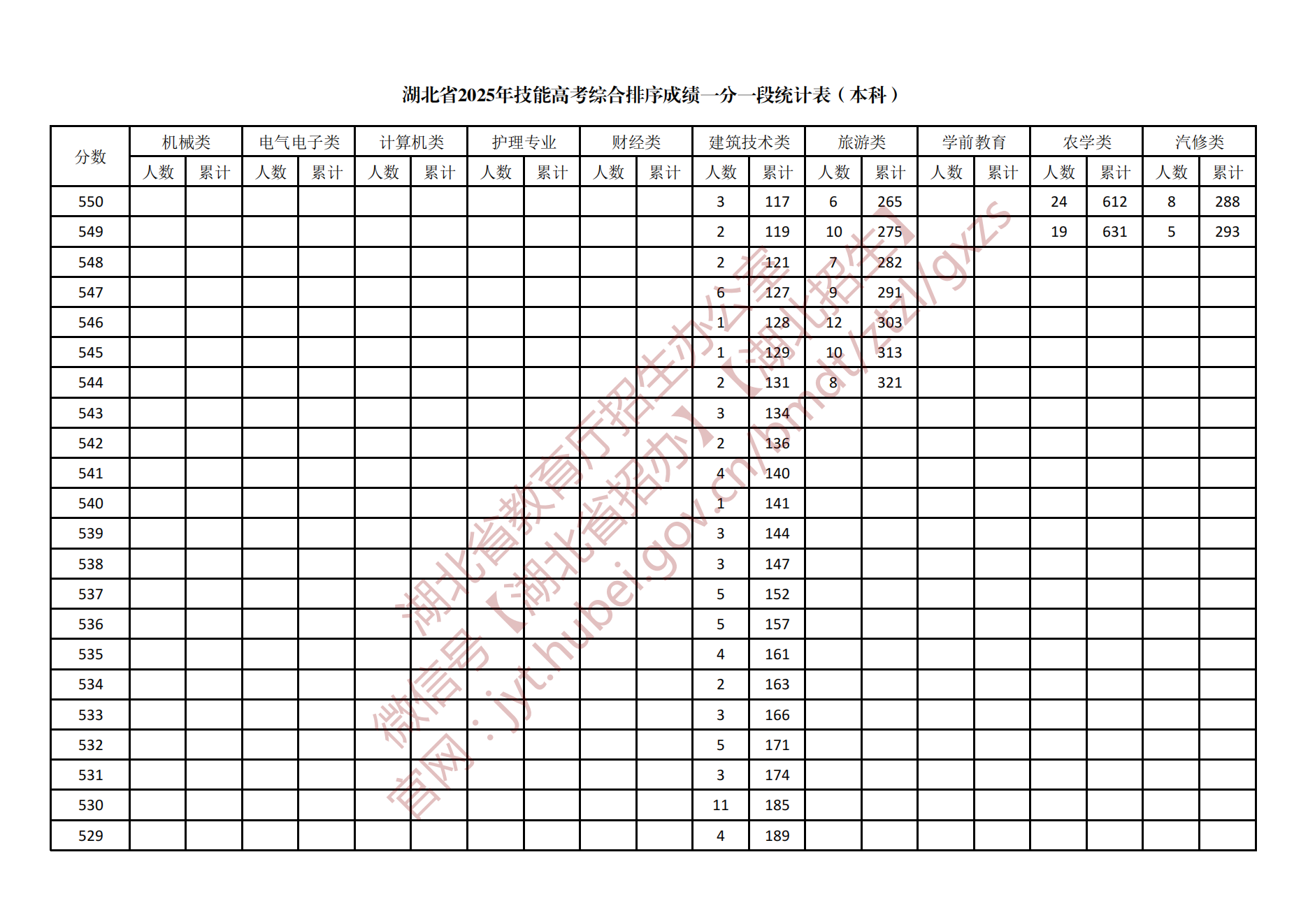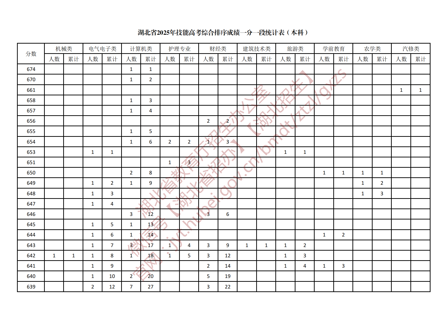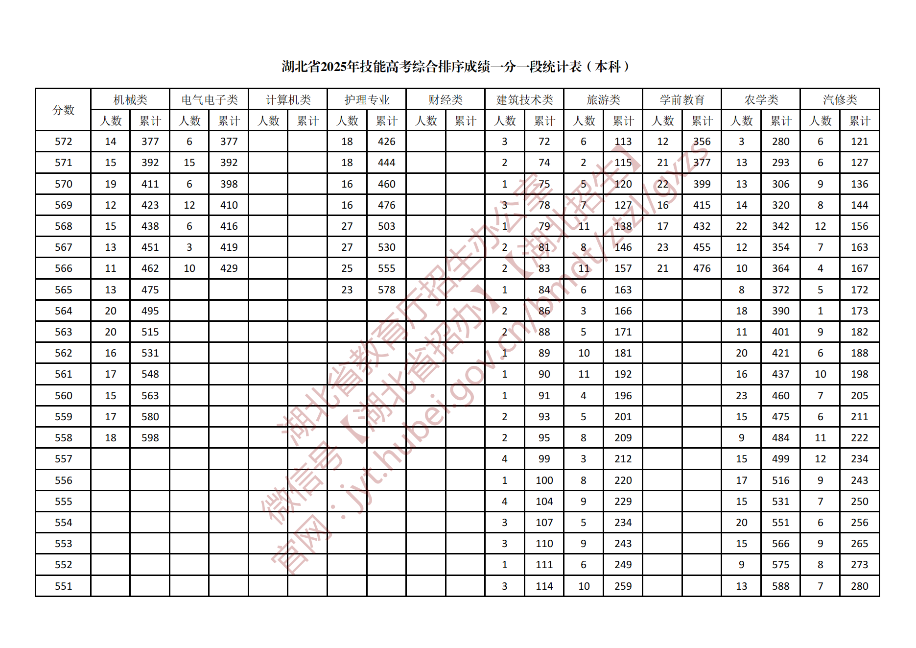 湖北省2025年技能高考综合排序成绩一分一段统计表(本科)