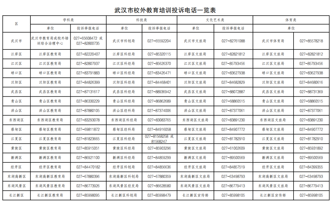 三、主动监督举报,共建规范秩序。如您发现违规行为,欢迎及时监督举报,可拨打各区主管部门电话进行反馈,也可拨打市民热线12345。市、区校外教育培训投诉电话详见市教育局网站关于《武汉市校外教育培训投诉电话一览表》公示信息。