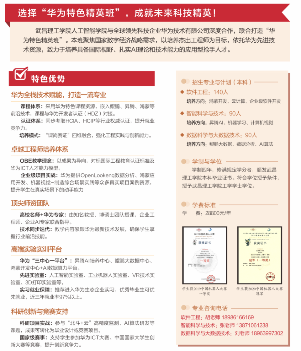 武昌理工学院人工智能学院与全球领先科技企业华为技术有限公司深度合作,联合打造“华为精英班”。依托华为先进技术资源,培养具备国际视野、扎实理论和技术能力的应用型抢手人才。