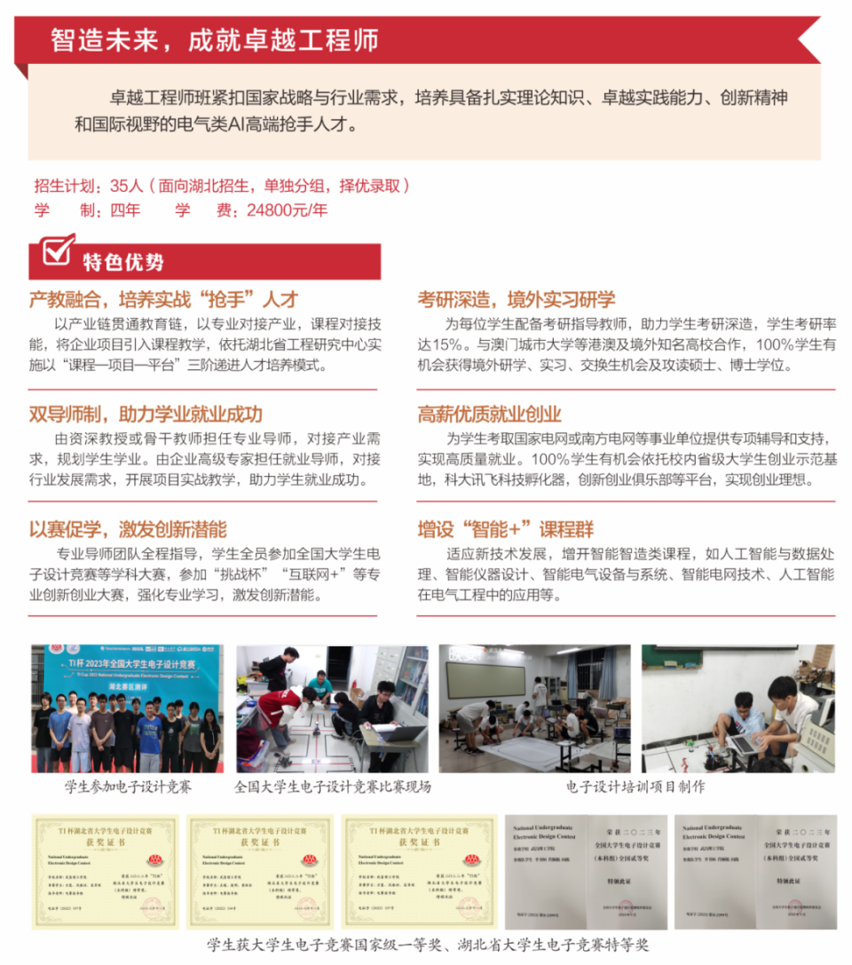 学校开设“华为精英班”、电气工程及其自动化“卓越工程师班”、工商管理精英班等特色班。制定专门的人才培养方案实施精准育人,配备硬核师资助力学业就业成功。