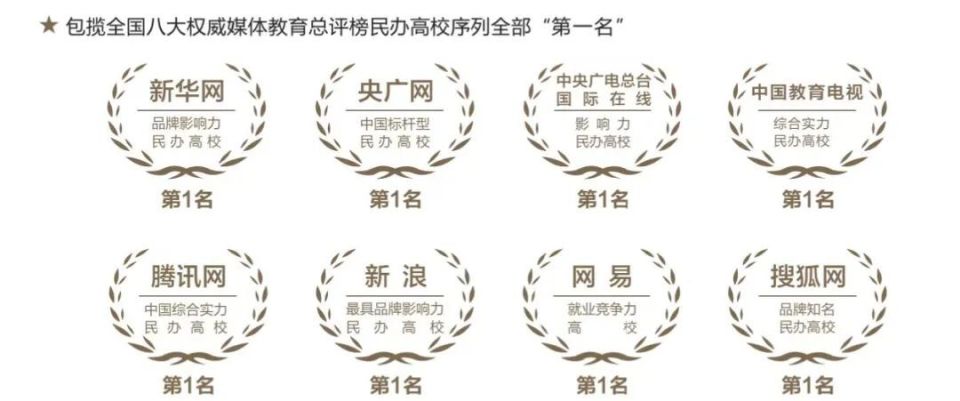 学校连续多年在新华网、央广网等全国八大权威媒体年度教育总评榜中获评全国同类高校第1名。在ABC中国民办大学排名中连续三年位居全国第2名;在2025年软科中国民办高校排名中位居全国第7名。
