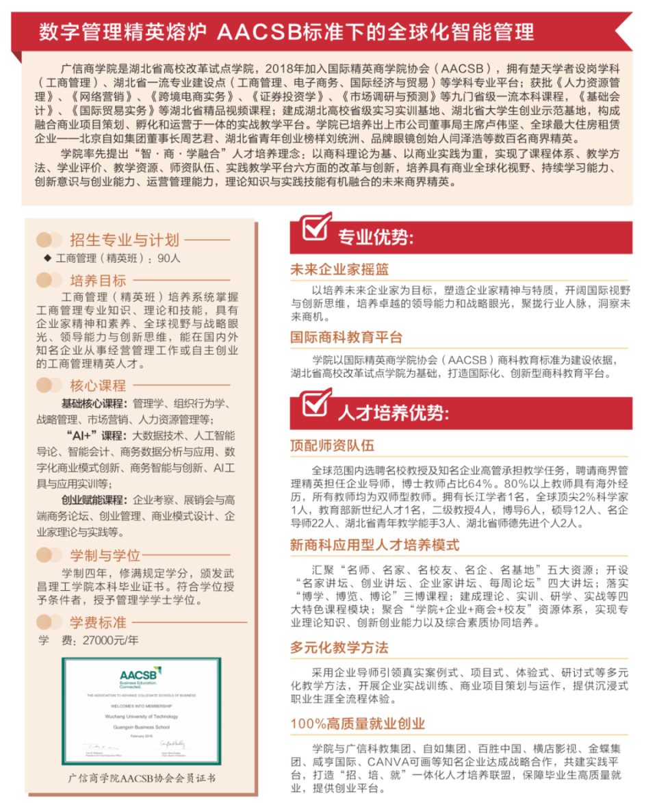 工商管理精英班构建“学术大师+产业导师+国际名师”的黄金师资矩阵,采用“案例研讨+沙盘推演+企业实战”的多元教学法,与众多龙头企业共建“招培就”一体化联盟,毕业生直通世界500强、行业头部企业。
