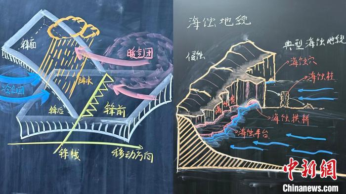 图为袁晓在课堂黑板上绘制的冷暖气团图和海蚀地貌图。受访者供图