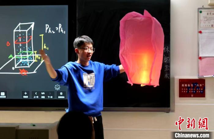 袁晓在课堂上模拟孔明灯放飞,为学生讲解地理知识。受访者供图