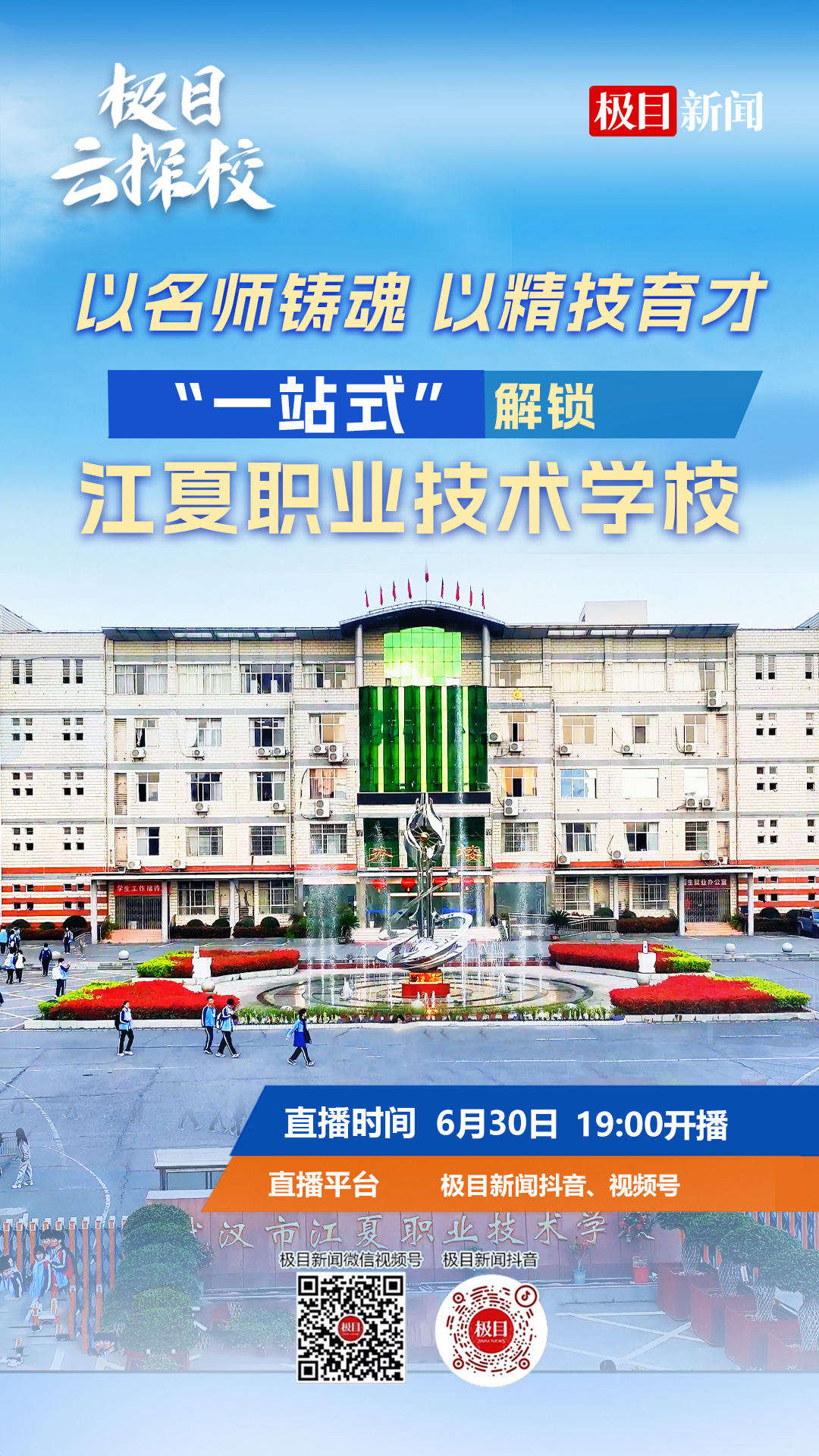 6月30日19:00,“极目云探校·2025年武汉高中学校特色展示”武汉市江夏职业技术学校专场节目,将在极目新闻官方微信视频号、官方抖音等平台直播,敬请关注!更多高招资讯,欢迎加入极目新闻高三家长QQ群(2群群号:746763123)。