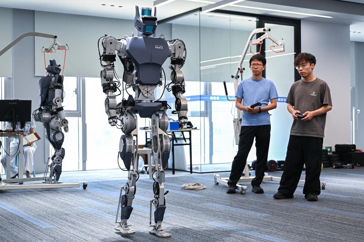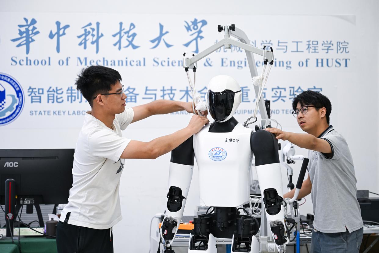 6月30日,在武汉格蓝若智能技术股份有限公司,华中科技大学博士研究生钱乐天(右一)和团队成员准备对“劳动者”系列人形机器人进行调试。新华社记者 杜子璇 摄