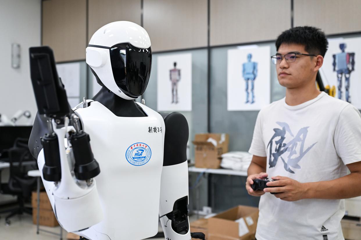 6月30日,在武汉格蓝若智能技术股份有限公司,华中科技大学博士研究生钱乐天(右)对“劳动者”系列人形机器人进行平地全向行走测试。新华社记者 杜子璇 摄