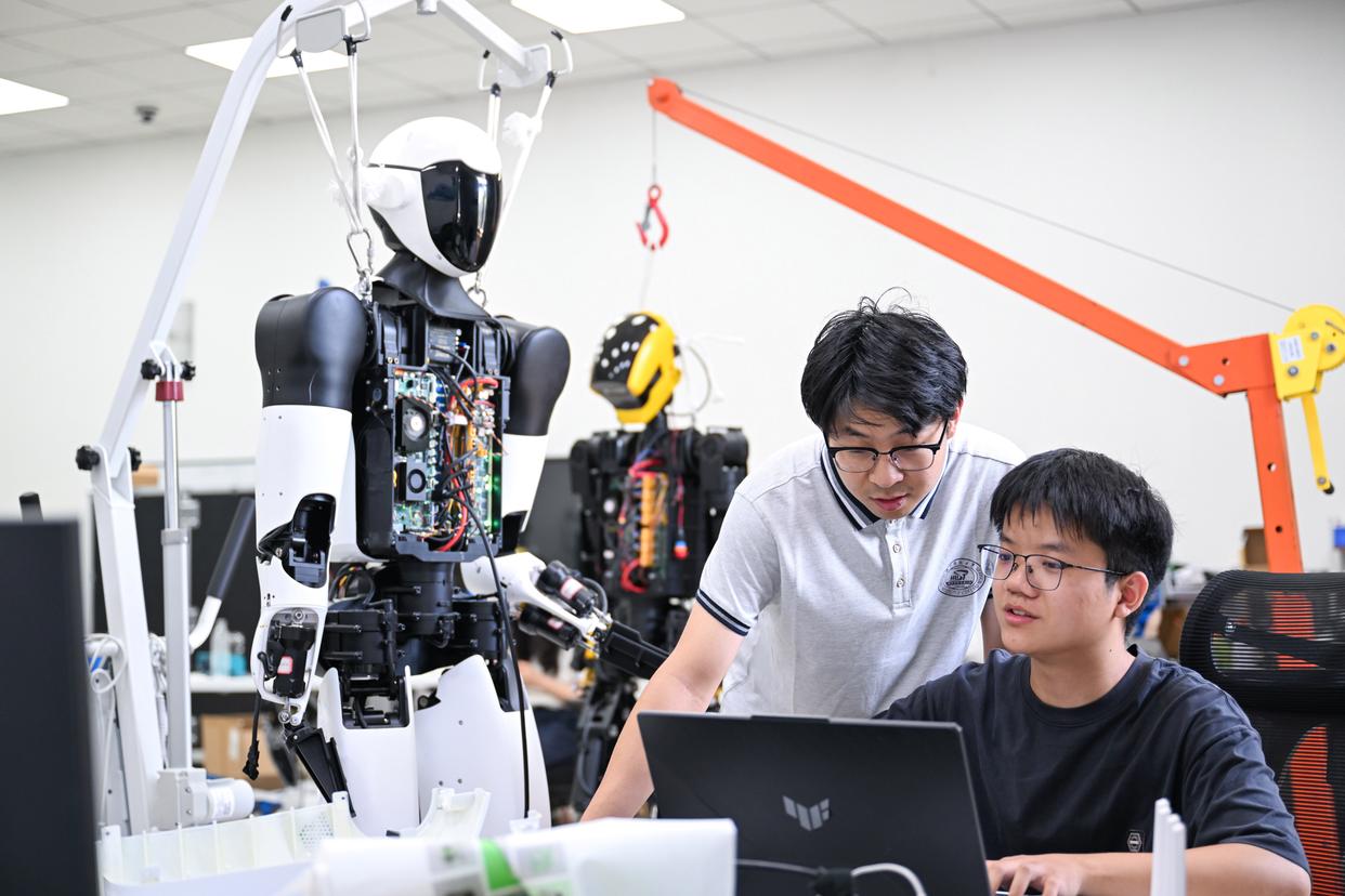 5月29日,在华中科技大学机械科学与工程学院,博士研究生丁涛(右)与博士研究生林宇辰放置“荆楚”人形机器人。新华社记者 杜子璇 摄