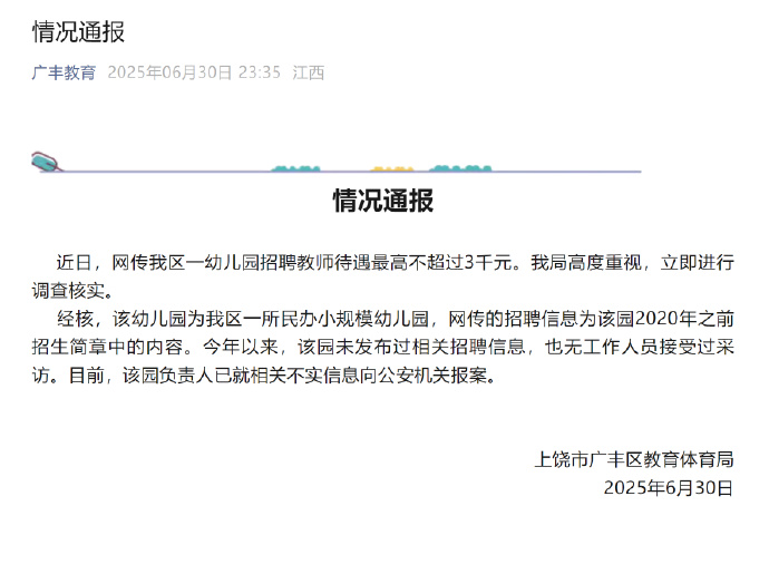 6月30日,江西上饶市广丰区教育体育局发布情况通报,近日,网传广丰区一幼儿园招聘教师待遇最高不超过3千元。该局高度重视,立即进行调查核实。