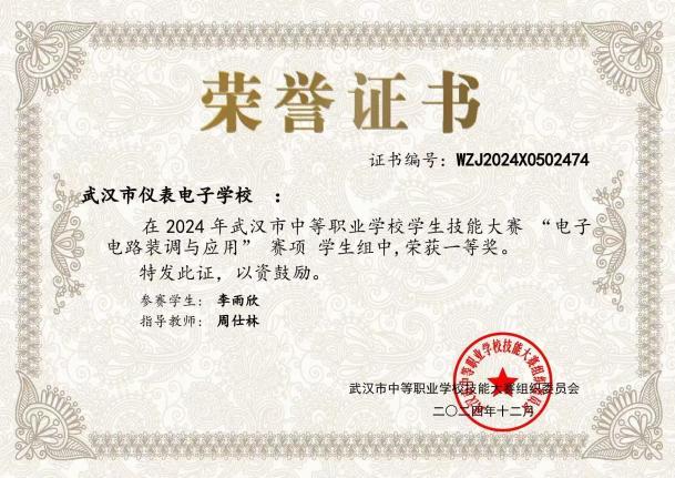 在班级中,李雨欣担任副班长,以身作则,积极协助许一帆开展班级工作、组织班级活动,营造良好的学习氛围。曾获武汉市数学竞赛二等奖、武汉市电子装调竞赛一等奖。