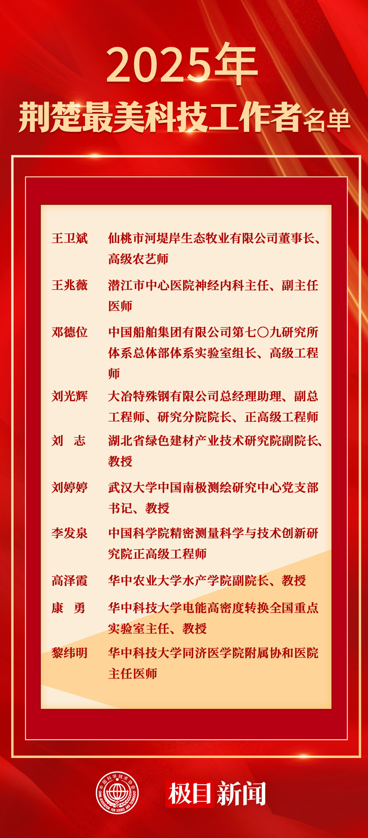 7月1日,湖北省科协发布“2025年荆楚最美科技工作者”名单,十位科技工作者当选。
