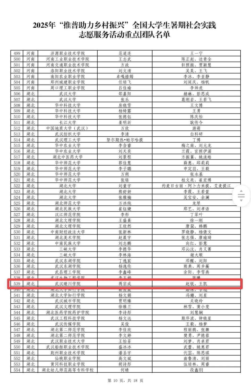 近日,2025年“推普助力乡村振兴”全国大学生暑期社会实践志愿服务活动入选团队名单公布,经过国家语言文字推广基地专家的严格评审,武汉晴川学院熠“艺”“声”辉推普实践团在全国1680所高校的8013支团队中脱颖而出,成功入选全国重点团队。