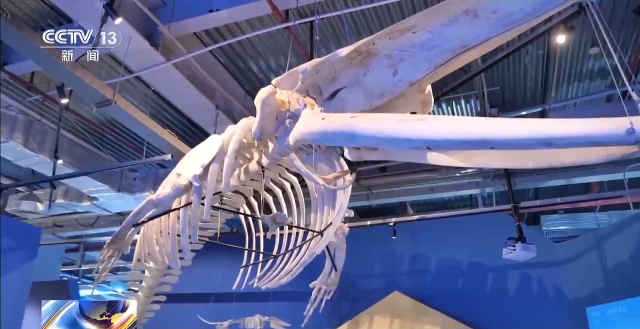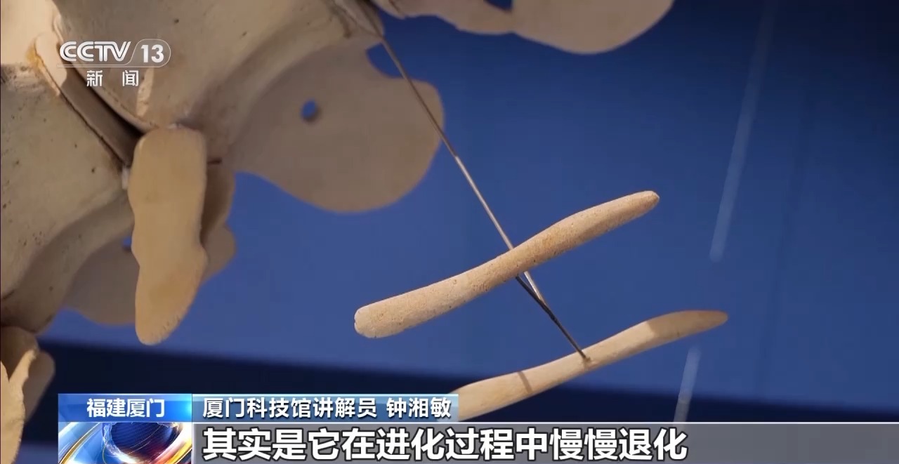 厦门科技馆讲解员钟湘敏:这边还可以看到一个小彩蛋,就是鲸鱼藏在身体里的后腿,这两个小小的骨头是它在进化过程中慢慢退化,藏在身体的盆骨部分。