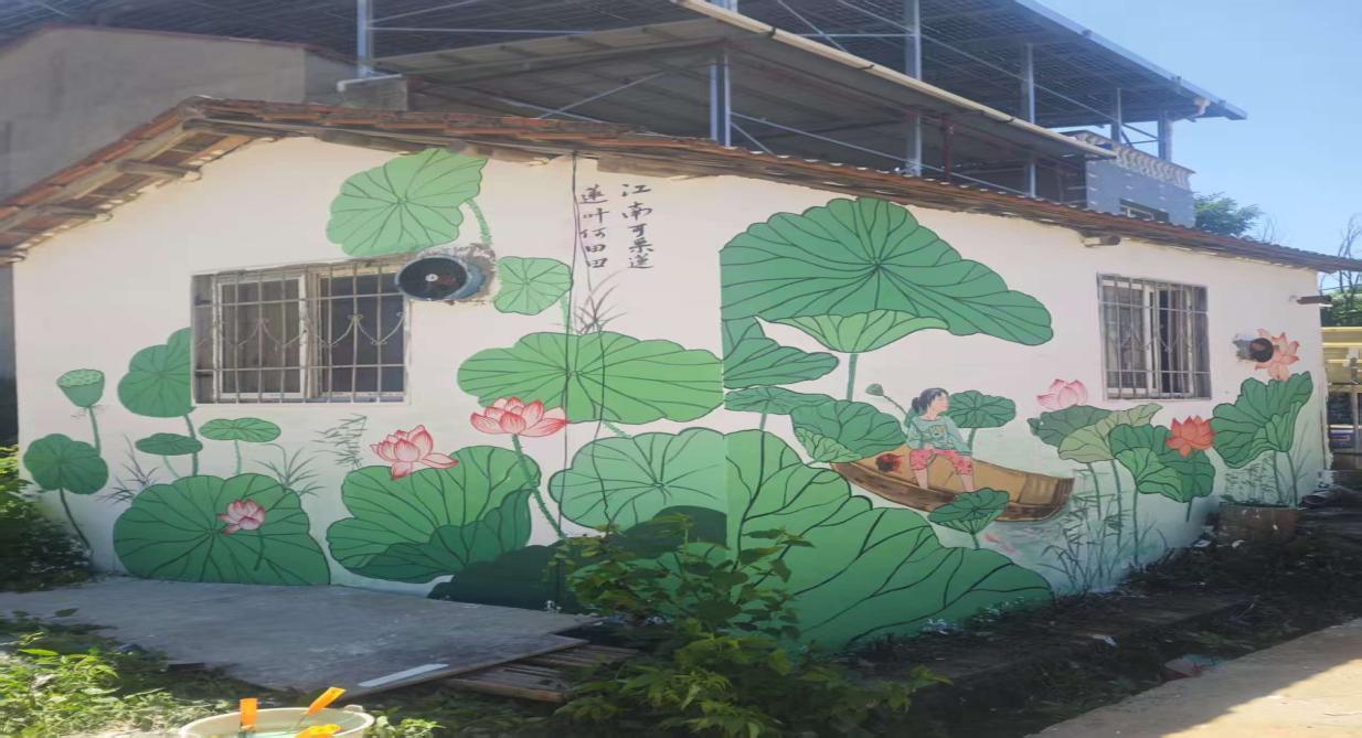 为贯彻“党建引领+专业赋能”理念,确保墙绘作品完美融入乡村风貌、彰显地域特色,武汉城市学院“红色画笔先锋队”采用“实地考察与线上会议融合”的工作模式,将当地特色植物莲花与“清廉”意象相结合,彰显乡村清廉建设风貌,以鸡鹅觅食、谷物丰收的图景,具象化村民的质朴生活与乡土风情。
