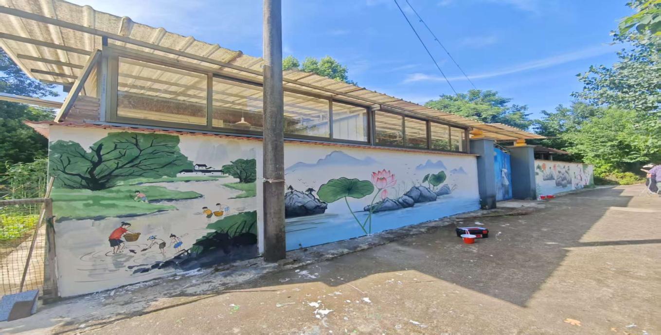 师生们的付出赢得了村民们的真挚情谊。在开展墙绘工作期间,村民们以淳朴热情的态度全力支持学生团队。他们纷纷送来梯子、水桶等工具,更自发将自家种植的西瓜、熬制的绿豆汤送到作画现场,搬来桌椅供学生休息,甚至还守在一旁用扇子为同学们扇风解暑。当地小朋友们也被色彩斑斓的创作吸引,也纷纷加入绘画行列。