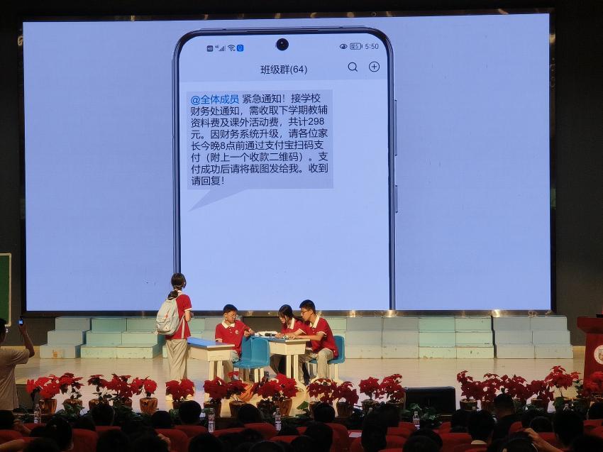 “官方给我发消息了,免费获得门票,我也太幸运了吧。”“只要点击这个链接,我就可以有这些奖品啦。”针对网络电信诈骗,该校学生以话剧的形式带来一场生动的讲解,他们结合真实案例拆解“低价买游戏皮肤”“免费领演唱会门票”“班主任短信收款”等电信诈骗套路,提醒同学们免费福利看官宣、陌生私信要当心,“聪明反炸不上当,快乐成长我最棒。”