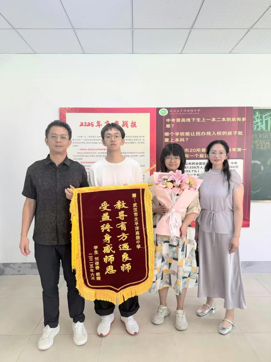 随着2025年高考成绩揭晓,武汉市太平洋高级中学的高三学子们捷报频传。“教导有方遇良师,受益终身感师恩!”“春蚕丝方尽,育人永不朽!”两面来自高三一班任同学和高三八班刘同学的锦旗,赠予该校全体老师,今年高考任同学以物理类526分的成绩、刘同学以历史类534分的成绩,双双从中考普高线下生逆袭,到如今冲上本科线,他们各自在旗帜中表达了对太平洋高中老师们的感激。