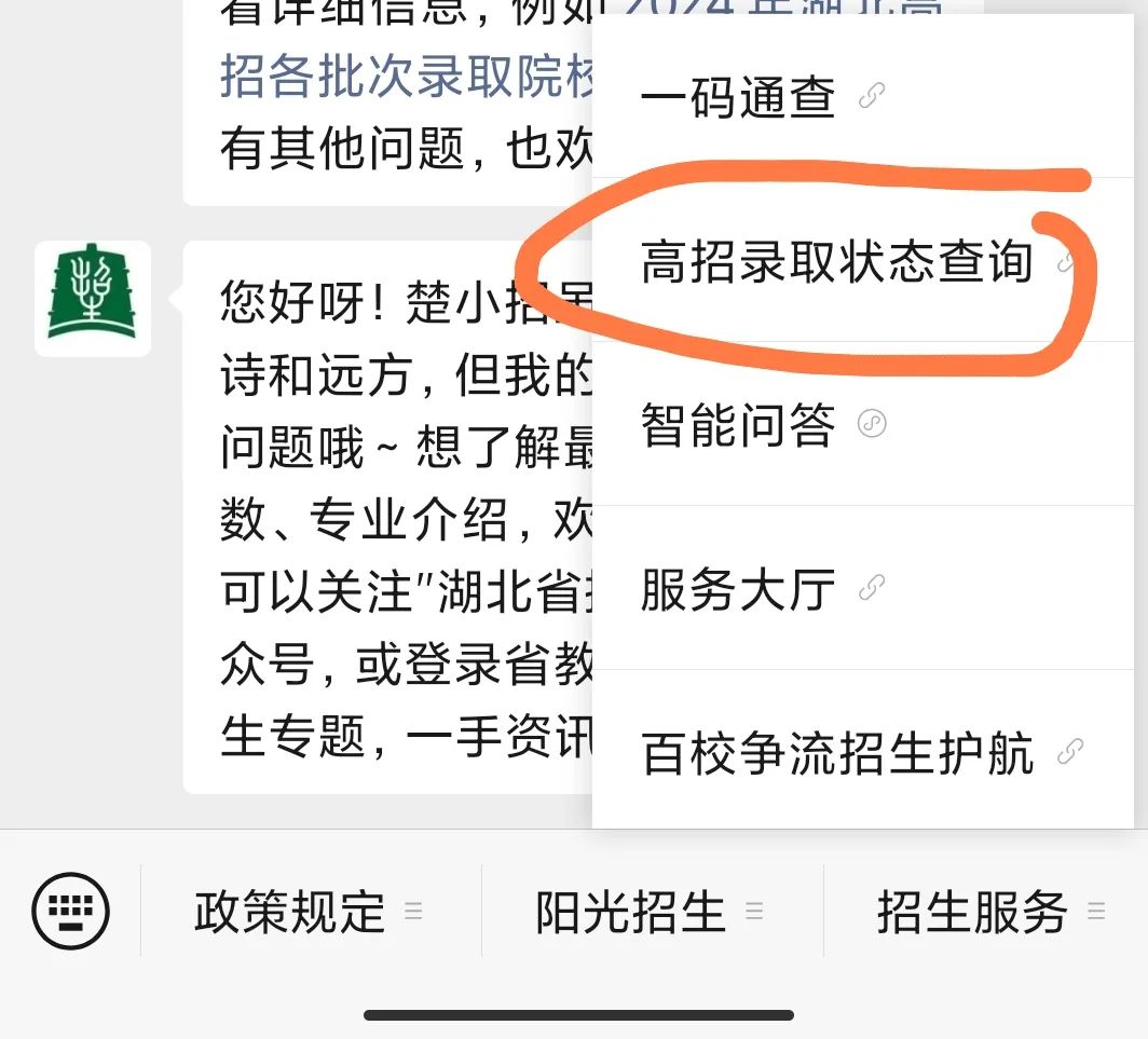 考生可关注微信公众号“湖北省教育厅”和“湖北省招办”(微信号hbszsb),点击菜单栏“高招录取状态查询”按钮,凭高考报名号或准考证号以及身份证号免费查询。