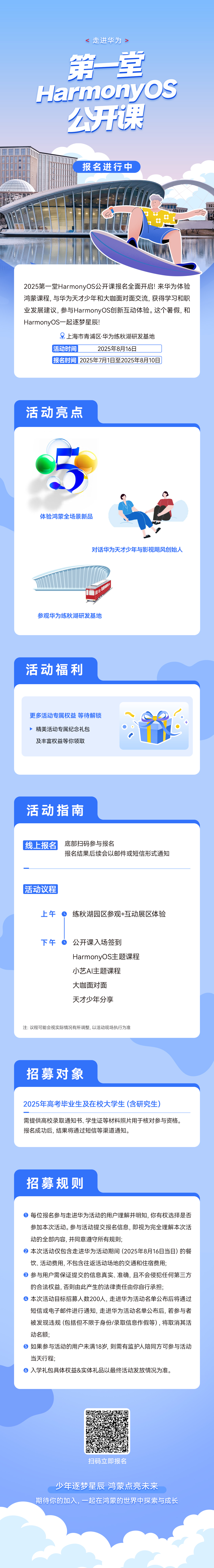 Ready for鸿蒙新旅程?高考毕业的萌新及在校大学生(含研究生)们,这个夏天别宅了!华为延续人才培养初心,再度开启备受关注的“第一堂HarmonyOS公开课”。作为自2024年首创以来持续举办的开发者启蒙活动,今年将于8月16日在华为上海练秋湖研发基地举行,名额翻倍,鸿蒙体验升级,等你来开团!快来解锁鸿蒙生态的无限可能,点燃你的创新小宇宙吧。