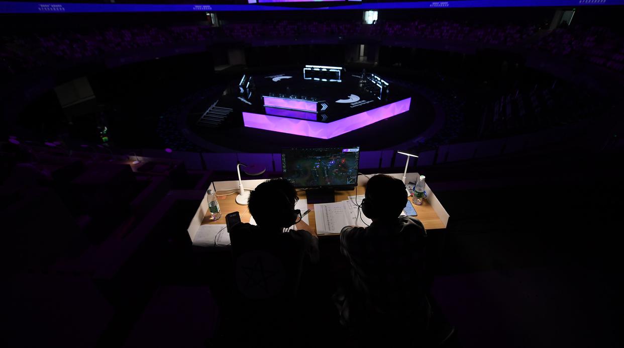 网络直播嘉宾在场边对电竞比赛进行解说首都体育学院