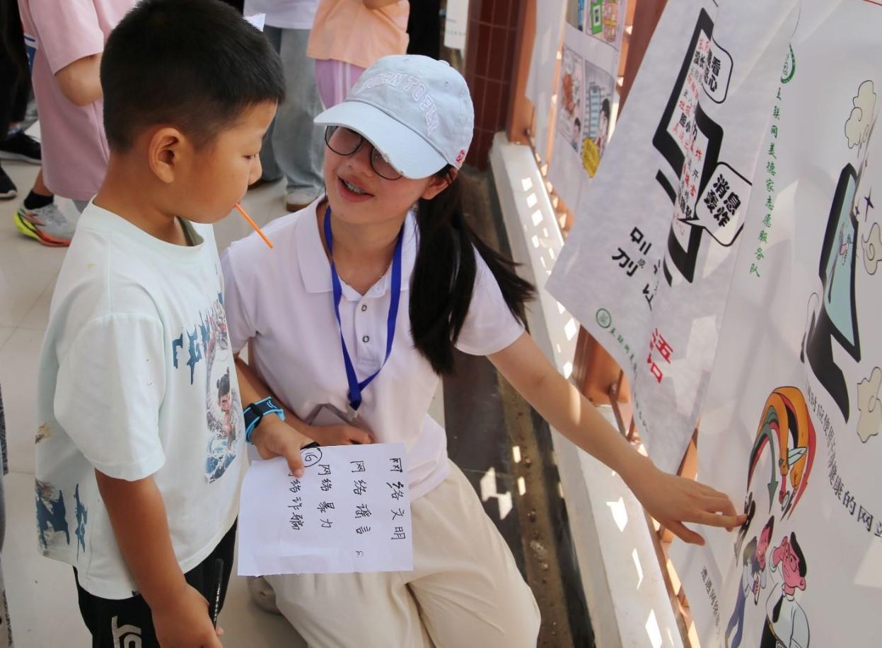 活动伊始,“互联网美德家”服务队的志愿者向孩子们介绍了“网络文明”“网络谣言”“网络暴力”和“网络诈骗”四大学习主题,引导他们从观看专题海报开始学习。“看!这是手机Wi-Fi标志,波浪像水浪,提醒我们要像防溺水一样防止沉迷网络。”“这幅漫画说网上讲话也要有礼貌,不能说脏话。”在社区活动中心走廊,孩子们三五成群,或驻足细看,或用纸笔记录,或互相讨论。志愿者在一旁适时引导,帮助孩子们理解海报传递的网络安全理念。