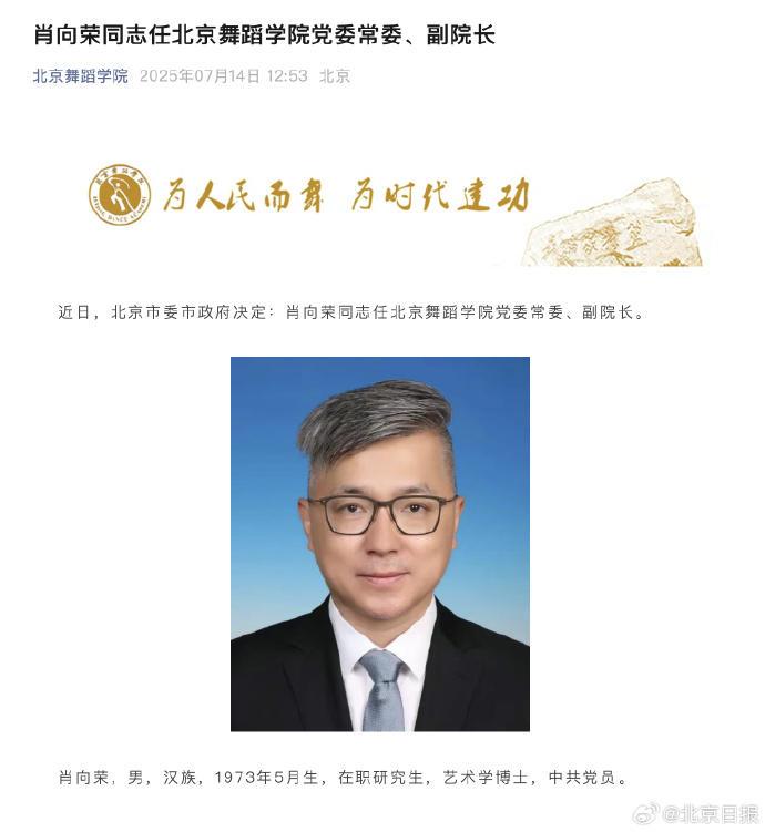 据北京舞蹈学院7月14日发布,近日,北京市委市政府决定:肖向荣同志任北京舞蹈学院党委常委、副院长。肖向荣,男,汉族,1973年5月生,在职研究生,艺术学博士,中共党员。