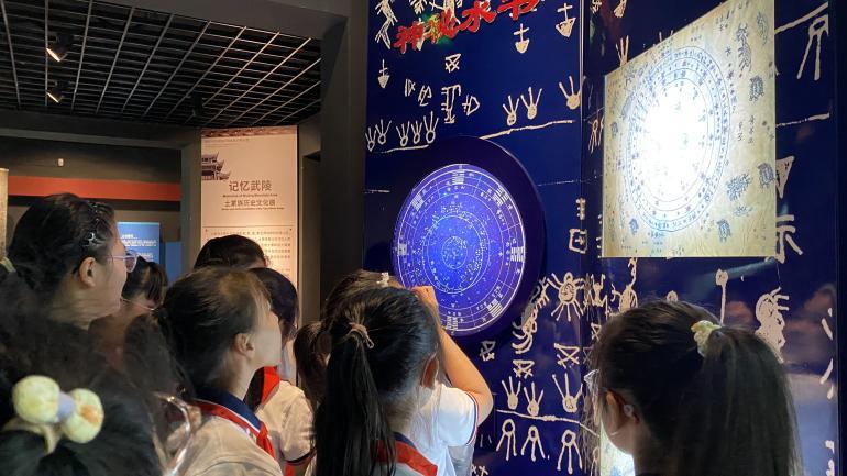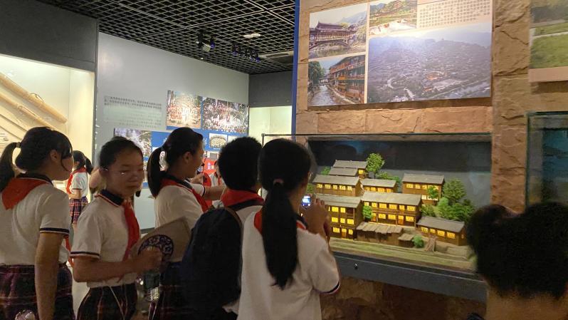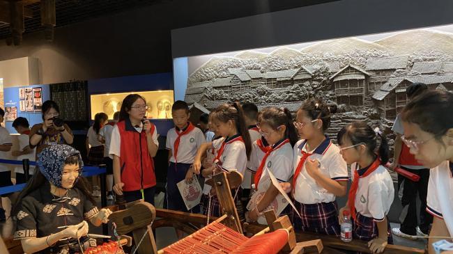 在讲解员引导下,师生依次参观馆内七个主题展厅。当走进“记忆武陵”展厅时,一架小巧的轿子让孩子们挪不开眼。“为什么这个轿子这么小呀?” 一名同学忍不住发问。“古时女子常常十二三岁就出嫁了,这样的轿子刚好适合那时的她们。” 讲解员回答道。展厅中央,土家族女子织布机塑像也吸引了孩子们。他们围拢过来,好奇地打量着织布机的构造,有的还小声讨论着织布机的运作原理。