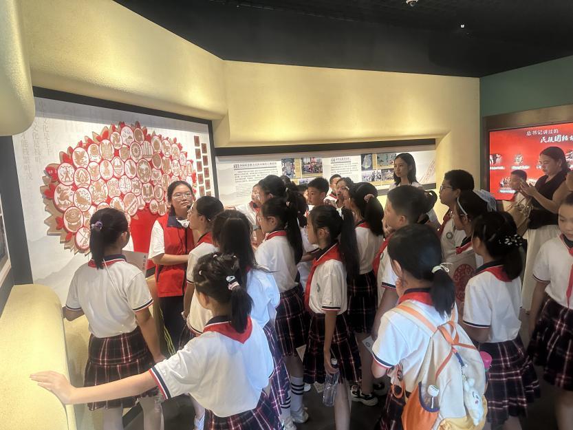 7月11日,武汉市鲁巷实验小学四(1)班30余名师生走进中南民族大学民族学博物馆,在“‘多彩民族·平安家园’洪山区暑期青少年政治安全课堂”活动中开启了一场童趣满满的民族文化探寻之旅。此次参观活动让孩子们在与民族文物的近距离接触中,体验了一堂生动的“铸牢中华民族共同体意识”启蒙课。